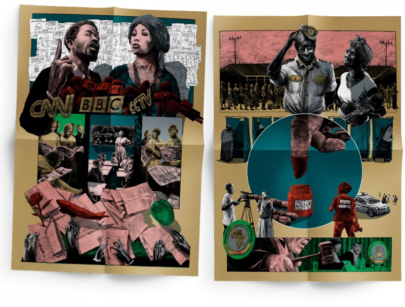 Das GIZ versorgte Florian Bayer mit Fotomaterial was bei Schulungen von Wahlbeobachtern entstand, dazu führte er zahlreiche Gespräche mit GIZ-Mitarbeitern und ihren Helfern vor Ort und nach zahlreichen Skizzen kristallisierten sich vier Motive heraus, die er zeichnete und collagierte.