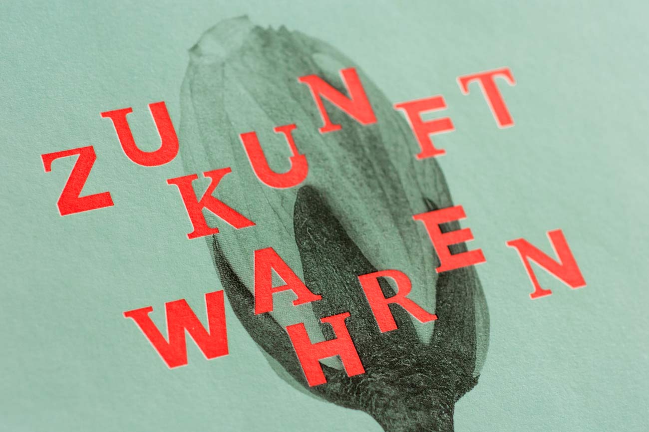 Zeichen & Wunder setzte im Key Visual auf ein Schrift-Composing, das eine klassische Serifenschrift mit einer modernen Serifenlosen verbindet. Zum Blickfang werden die Kommunikationsmittel außerdem durch die knallige Farbkombo Neonrot und Neonmint, die im Kontrast zur monochrom gehaltenen Blütenknospe steht. Die Blüte soll den Kongress selbst symbolisieren als Ort für Dialog, Ideen und Inspiration.