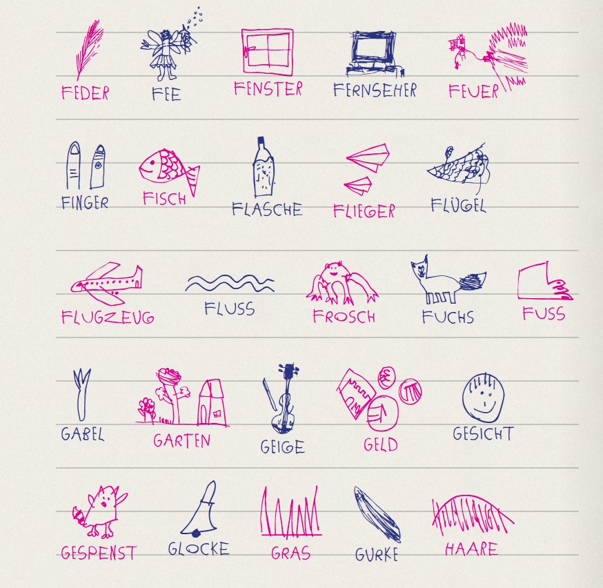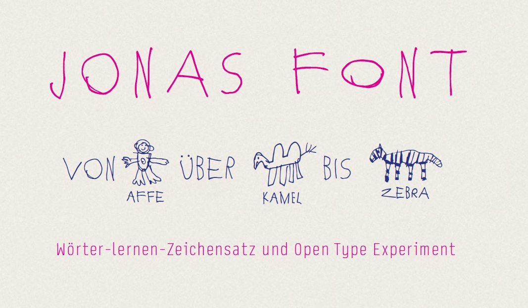 Jonas Font ist ein digitaler Zeichensatz, der das lateinische Alphabet sowie Satz- und Sonderzeichen umfasst. Nichts Besonderes, der Clou ist, dass es für fast 300 Wörter Zeichnungen gibt, die das eingetippte Wort automatisch durch ein Bild ersetzen. Die liebevollen Zeichnungen dieser Bilder stammen von dem sechsjährigen Jonas, der gerade in die Schule gekommen ist. Sie illustrieren den Grundwortschatz deutscher Grundschulen. Der Sohn von Typonauten Geschäftsführer Ingo Krepinsky blieb streng gegenständlich, abstrakte Begriffe wie Liebe bleiben das, was sie sind: unerklärlich. Dafür kann man mit Jonas Font einen Apfel mit einer Birne vergleichen.
