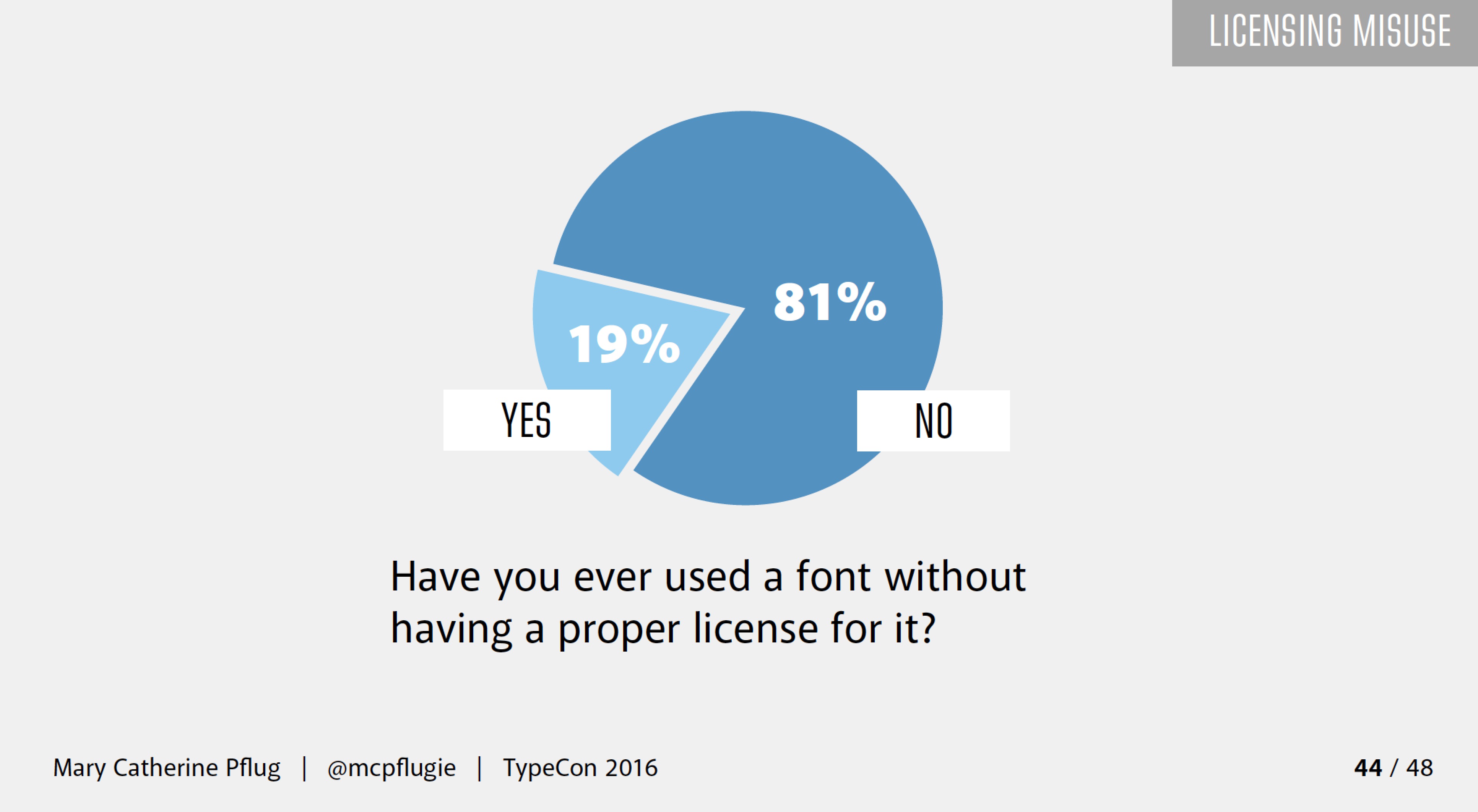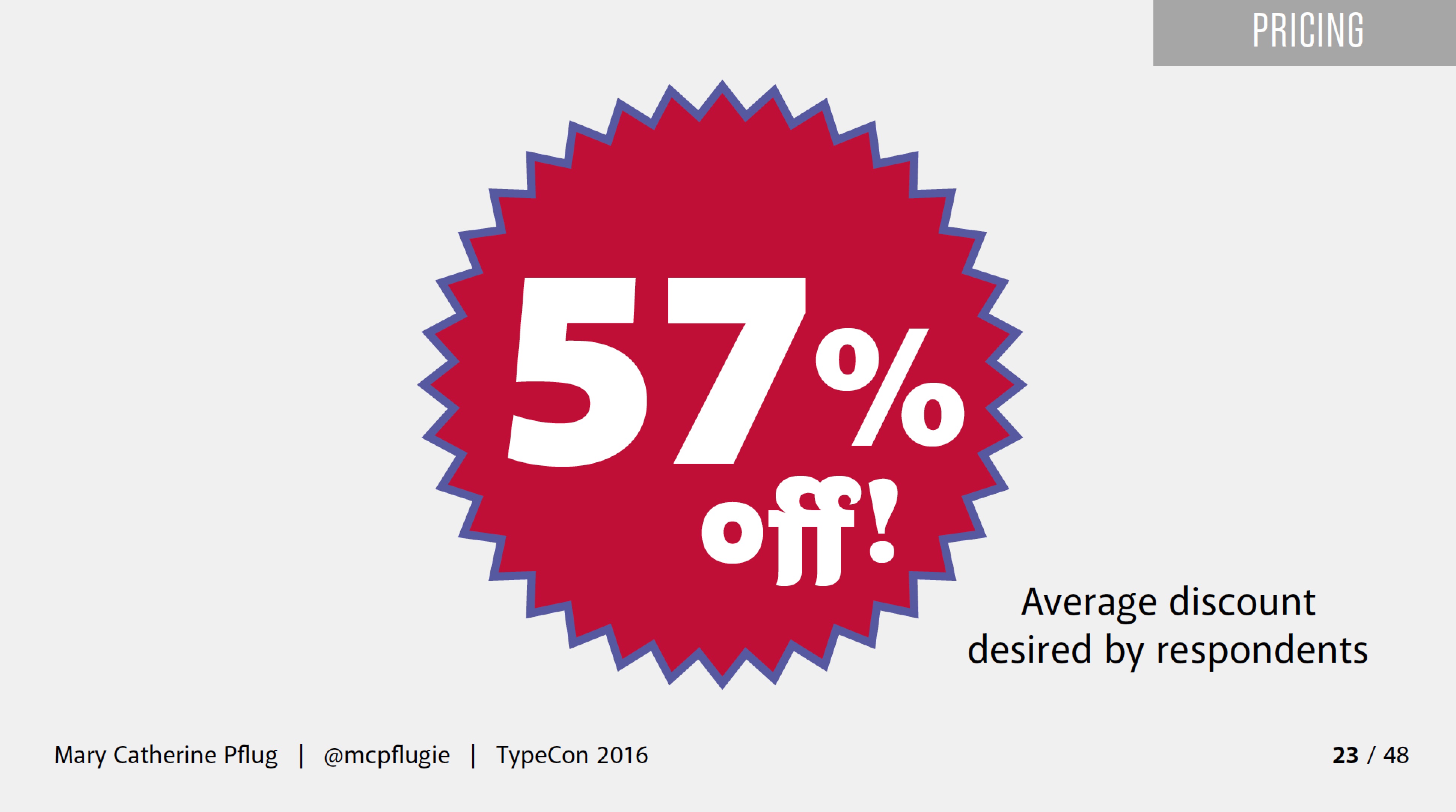 Die US-Amerikanerin Mary Catherine Pflug studierte zunächst Fine Arts mit Schwerpunkt Grafikdesign an der South Carolina Governor’s School und danach International Business am Rollins College in Winter Park, Florida. Für ihren Bachelor untersuchte sie Gewohnheiten von Kreativen beim Schriftenkauf: Woher beziehen sie ihre Fonts? Was ist ihnen wichtig? Kaufen sie spontan oder überlegt? Was halten sie von Discounts? Welche Rolle spielt die Zahl der Schriftschnitte? Greifen sie eher zu, wenn es einen Font der Familie gratis gibt? Insgesamt 44 Fragen stellte Pflug, die heute bei MyFonts arbeitet, und bekam 765 Antworten , die sie auf Medium.com veröffentlichte. »Als Typedesignerin mit vielen Freunden, die auch Fonts gestalten, höre ich viele Meinungen, Beschwerden, aber auch Ideen zum Thema Schriften verkaufen«, erzählt sie. Fast nie machte sich aber jemand Gedanken darüber, was die Leute, die Fonts kaufen und anwenden, denken. »Mir scheint jedoch die Meinung der Konsumenten mindestens so wichtig, wenn nicht wichtiger zu sein als die der Typedesigner.«