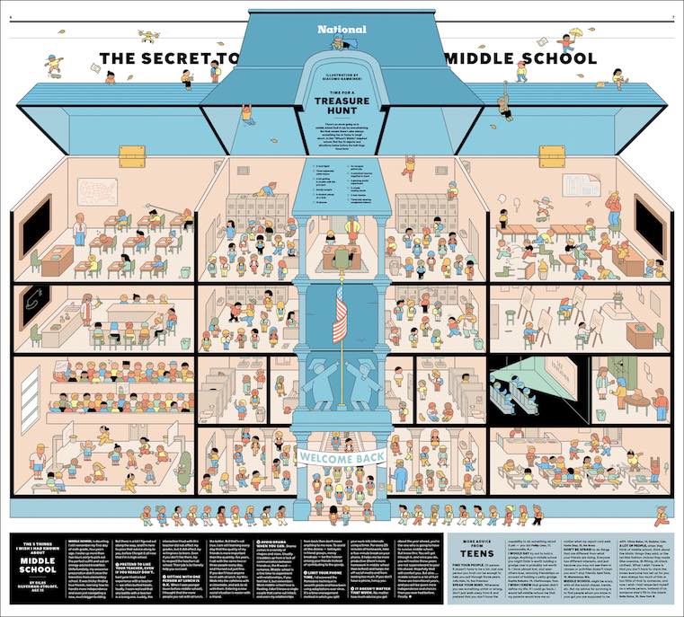 Die sommerliche Stimmung inspirierte die in New York lebende Ligne-Clair-Spezialistin Tomi Um zu einem reizenden Wimmelbild. Artdirektor war Kathryn Lavey. http://tomiillustration.com/