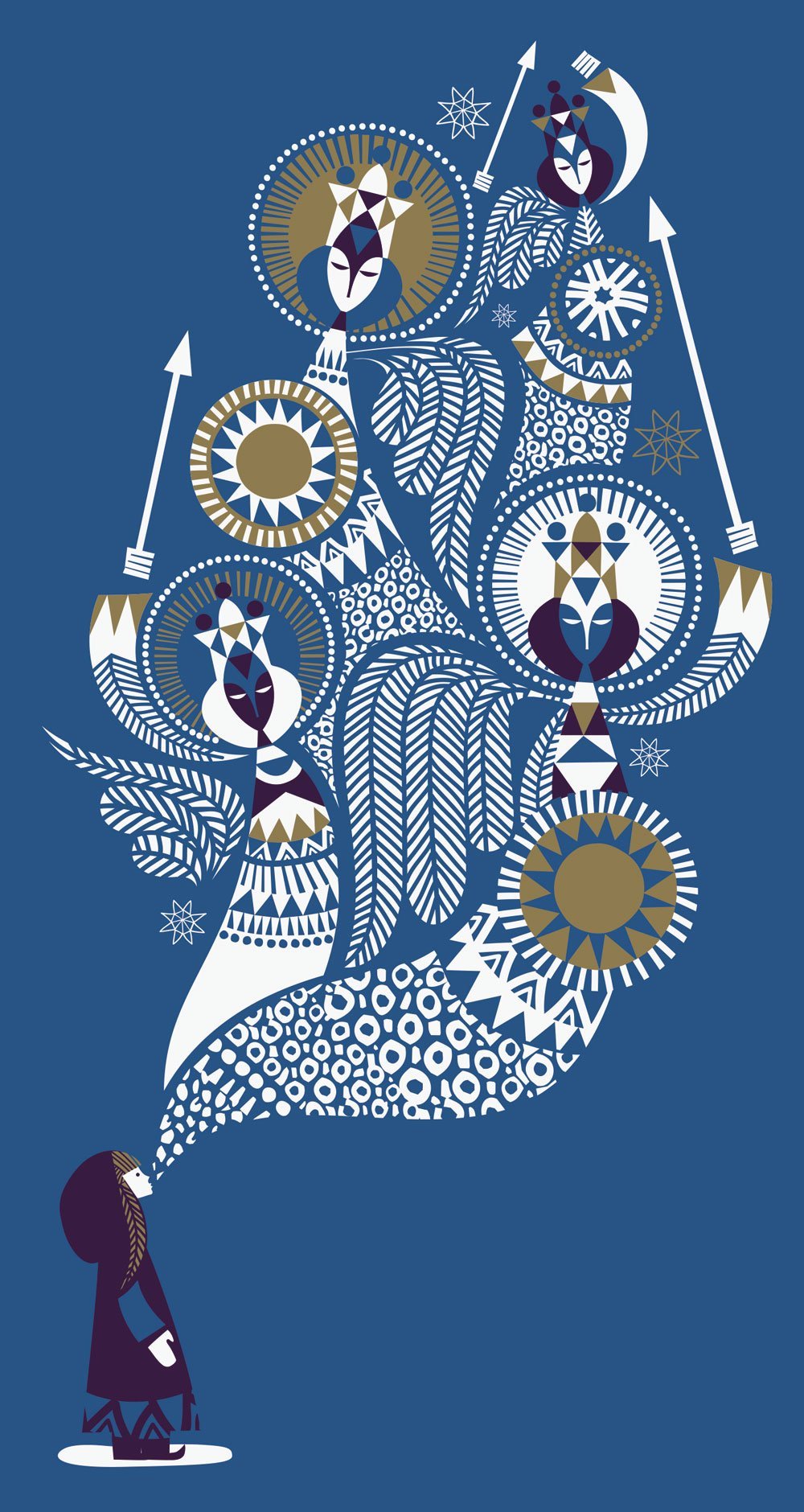 Sanna Annukka ist Tochter einer Finnin und eines Briten, aber ihre spirituelle Heimat ist der Norden von Finnland, wo sie als Kind die Sommer im Heimatdorf ihrer Mutter verbrachte. Das schlägt sich auch in ihrem Illustrationsstil nieder. Für die kultige finnische Textil- und Interior-Marke Marimekko fertigt sie Designs an, die aus dem finnischen Nationalepos Kalevala erzählen – viele dieser tollen Arbeiten sind auf der Website ihrer Repräsentanz Big Active zu sehen.