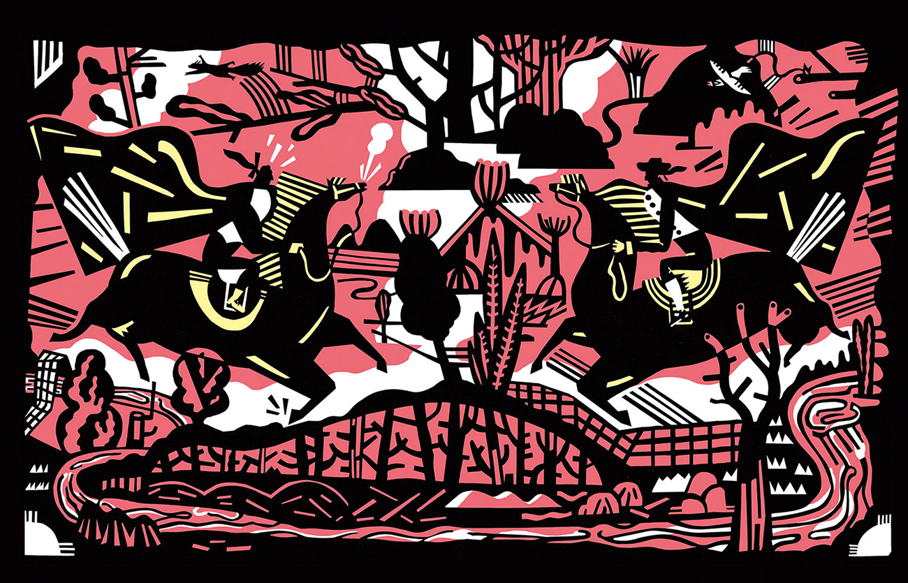 Stil Ich verfolge zwei Stile, die zum einen auf Zeichnungen, zum anderen auf Scherenschnitten basieren. Beim zeichnerischen Stil bin ich im Laufe der Jahre zu einem immer lockereren, dynamischen Strich gekommen. Dem gegenüber setze ich gerne geometrische Formen und Linien. Meine Bilder sind oft voller Details, die Menschen überzeichnet. Typisch sind viele Striche und Kringel, inspiriert von Comics aus meiner Kindheit. Sie transportieren z.B. Stimmung, stehen für Ausrufe oder sind kompositorische Gewichte.