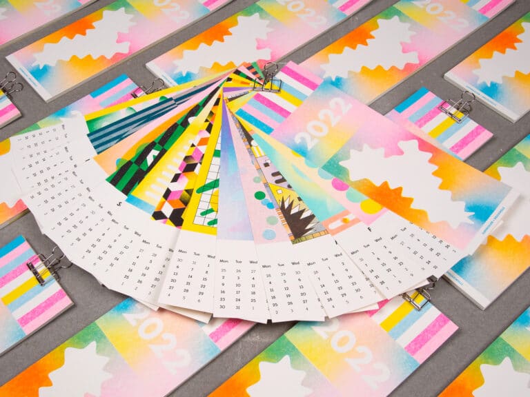 Eighties-Vibe und Sixties-Style, leuchtende Farben und ein cooles Format: Superkolor, Büro für Grafikdesign und Risographie aus Münster sorgt mit ihrem neuen Kalender für ein fröhliches 2022!