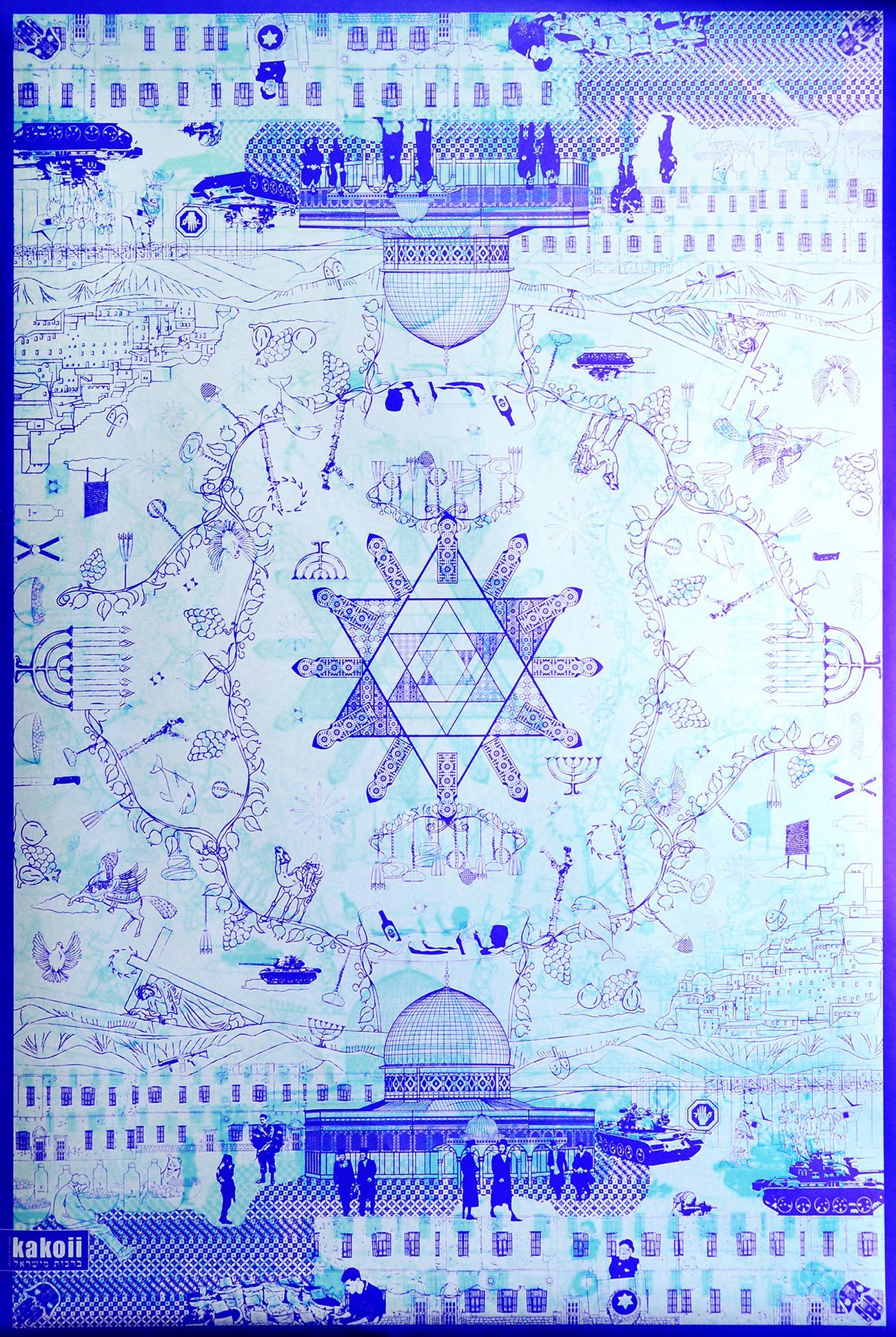 Entstanden sind drei schimmernde und changierende Kunstwerke, in denen Kamele auf Girlanden balancieren, Jesus sein Kreuz über stilisierte Hügel schleppt, Waffen im Gas liegen, Che Guevara über alten Straßenkreuzern erstrahlt, Teekannen neben chinesischen Girlanden schweben oder ein Pandabär ganz lässig an einer Fluppe zieht.