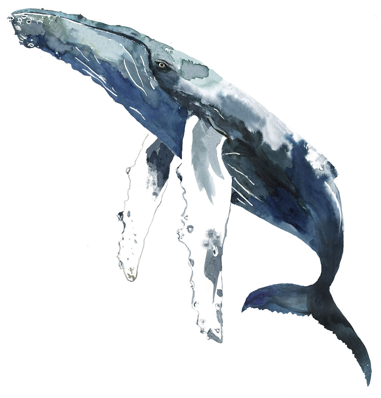 Und diese illustrierten Wale und Delfine sind in lasierenden Wasserfarben, deren durchscheinende Feuchtigkeit nicht nur das Wasser selbst zitiert, sondern auch die Bewegungen der Tiere auf ihrer Reise durch den Ozean.