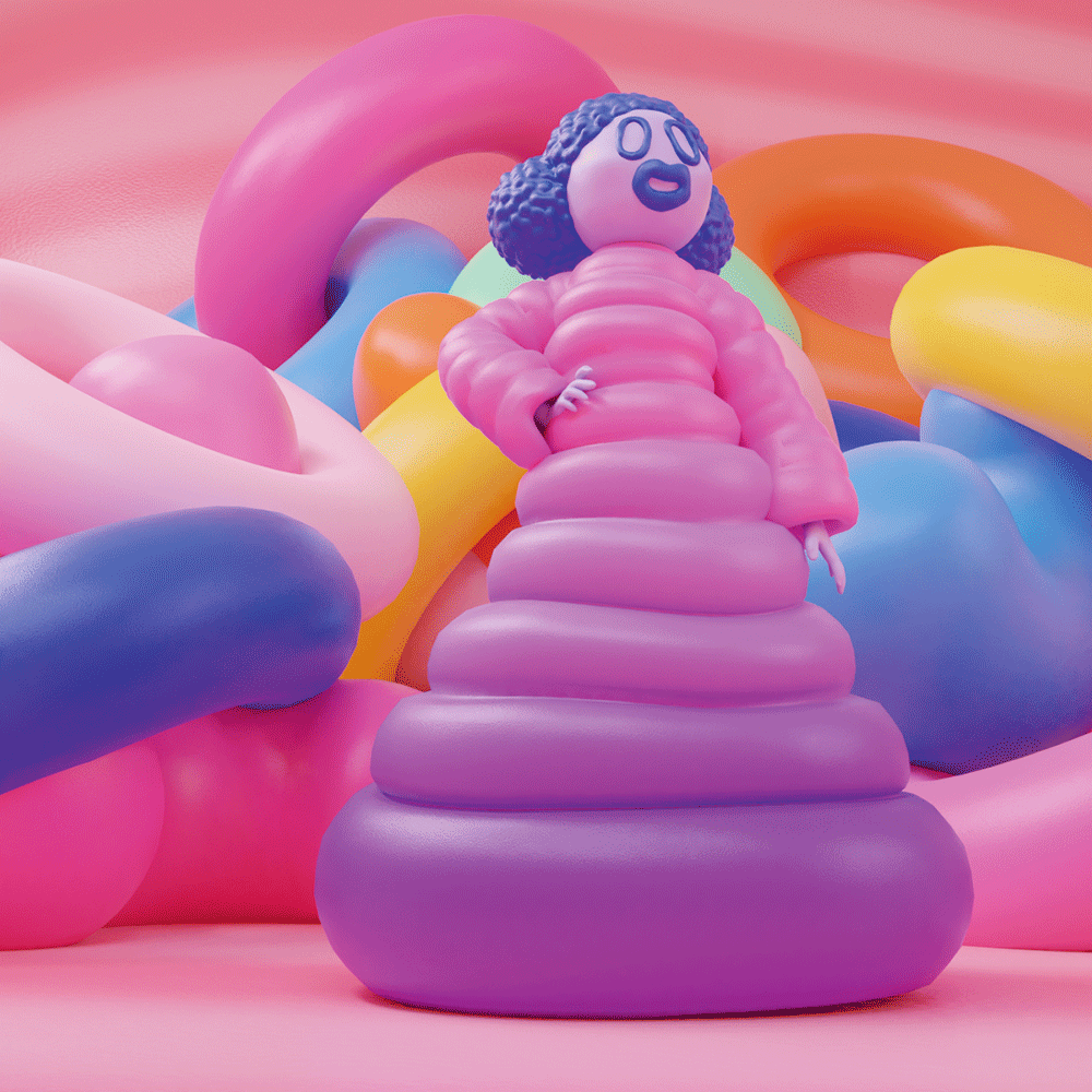 The first piece I made that I was really happy with was done in mid-January 2020. By then I had been following tutorials for three months full-time. These taught me what all the tools and modifiers can do. I think Blender is a bit more difficult to handle than Cinema 4D, but it’s free and open-source, so there are tons of tutorials. You can learn it all on your own. It might be overwhelming and frustrating in the beginning – but you will see improvements really fast. The longer you work with Blender, the more complex your projects become and the faster you work. A project that takes you a week now might take you only a day in a month from now! Step by step, you will discover your favorite tools, modifiers, backgrounds et cetera. This way you create your own workflow and visual language along the way. Once you have that, everything becomes so much easier because you don’t have to start from scratch anymore. Especially when you’re building a library: we now have a big collection of items such as fonts, lighting, stars, fruit and vegetables that we keep using. We also built a character generator that lets us combine different hairstyles, clothes and accessories.