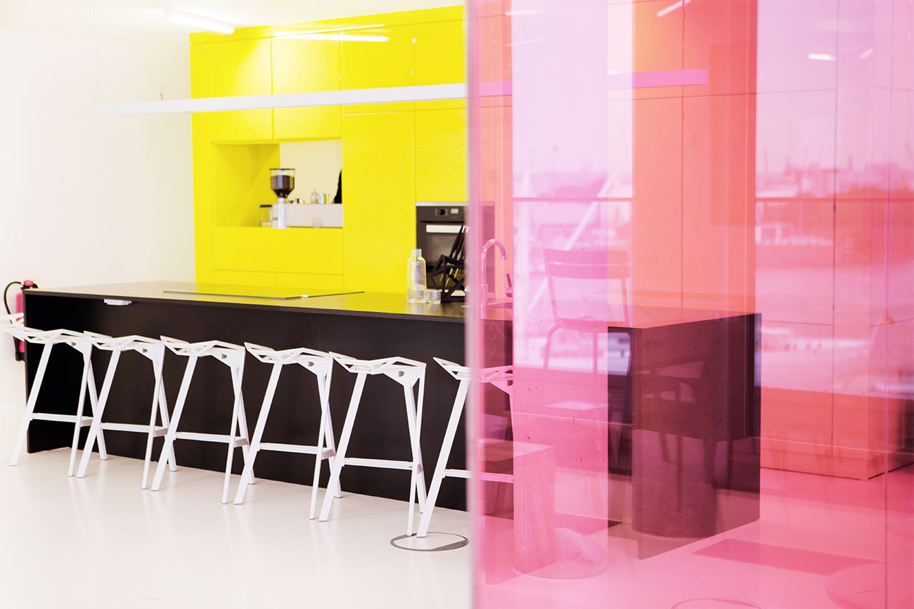 Bei loved geht es hingegen etwas bunter zu: Pinke Glasscheiben dienen als Trennwände, die große Küche leuchtet knallgelb, die Hocker sind pastellrosa-hellblau oder rot-pink, die Badezimmer komplett rosafarben oder gelb.