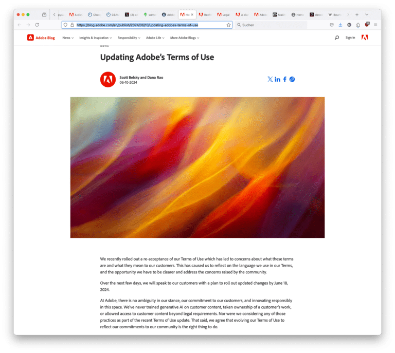 In einem gemeinsamen Adobe-Blog-Post vom 10. Juni 2024 weisen der Chief Strategy Officer, Scott Belsky, und der Executive Vice President bei Adobe, Dana Rao, angesichts der Aufregung noch einmal auf den Hintergrund der Aktualisierung hin – und betonen, dass die Inhalte der Kund:innen »… nie genutzt werden, um irgendein generatives AI-Tool zu trainieren« (Übersetzung vom Autor).