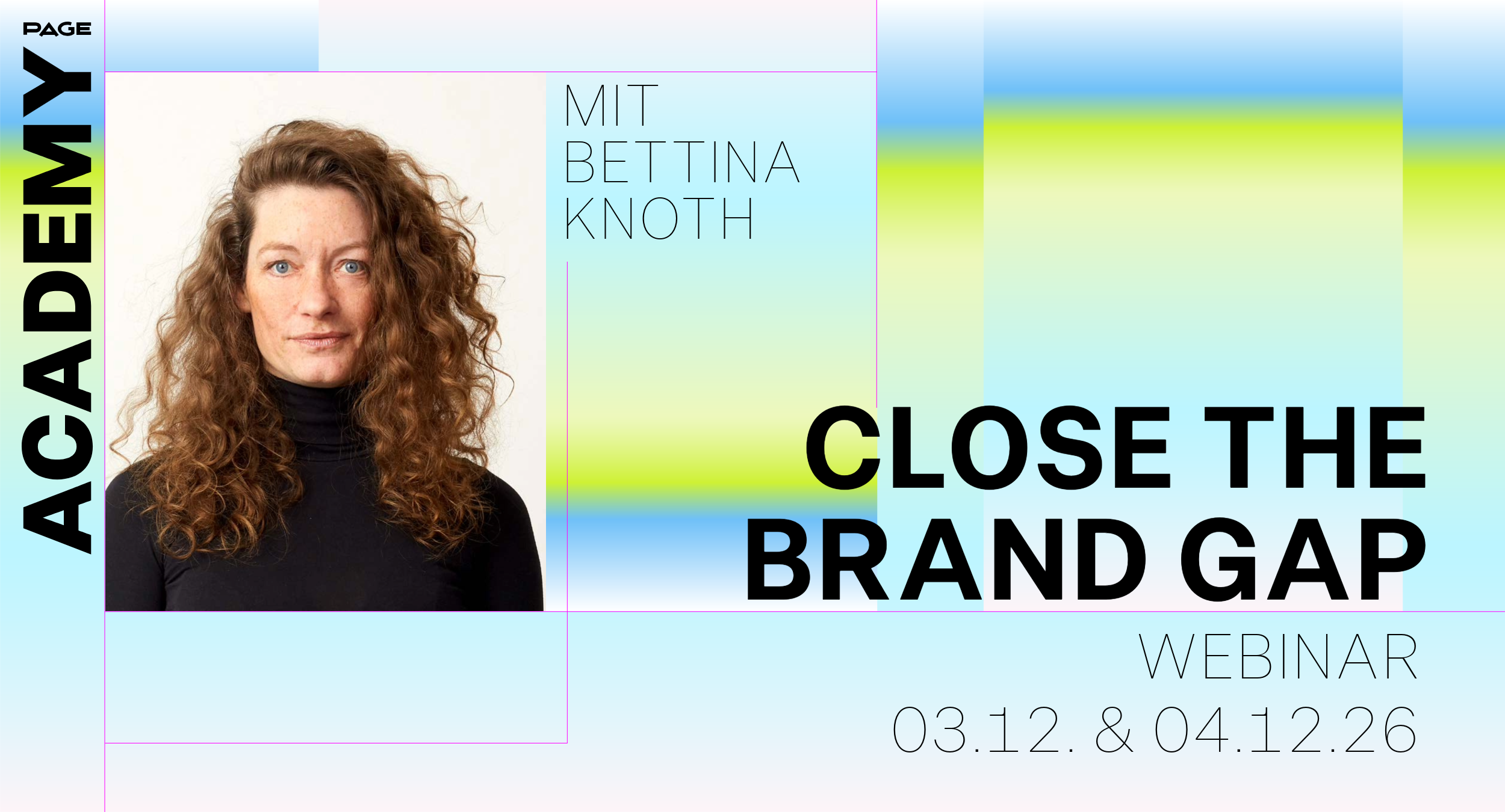 Das PAGE Webinar »Close the Brand Gap« befähigt euch zu einer zielgerichteten, kohärenten und sinnstiftenden Entwicklung und Führung von Marken. In drei Sprints blickt Bettina Knoth mit euch aus den Perspektiven Purpose, Culture und Customer auf die neuralgischen Punkte, die in der Verbindung von Brand Design und Strategy zu nachhaltiger Wertschöpfung führen. Und sie beleuchtet, welche Rolle KI dabei spielen kann. Worst-Case- und Best-Practice-Beispiele als Folie, Toolsets helfen bei der eigenständigen Anwendung.
