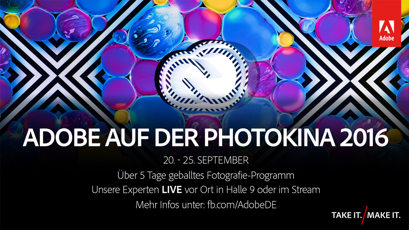 Live dabei sein – Ob vor Ort oder per Livestream, im Adobe Studio auf der Photokina wird es jede Menge Tipps, Tricks und Infos aus erster Hand geben.
