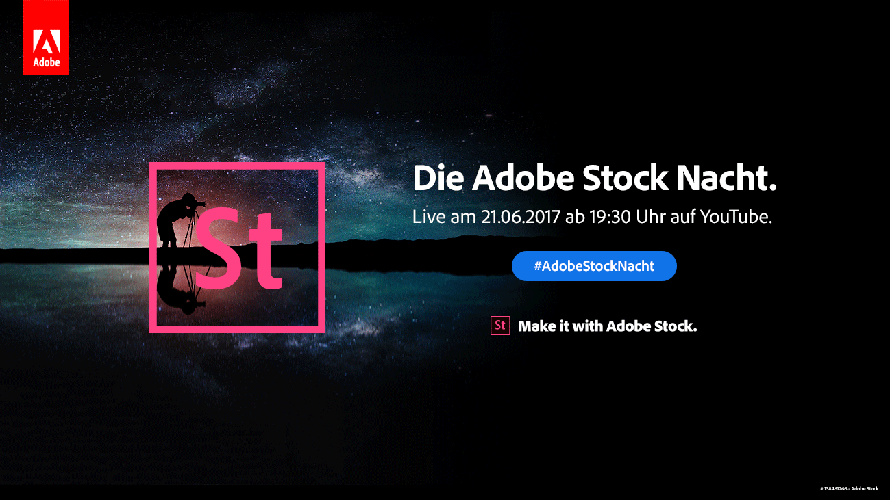 Wenn ihr die erste große #AdobeStockNacht erleben wollt, dann meldet euch hier unverbindlich für den Event an und schaltet am 21. Juni um 19:30 Uhr auf Adobes YouTube Kanal in den Livestream oder schaut direkt hier über den eingebetteten Player zu.