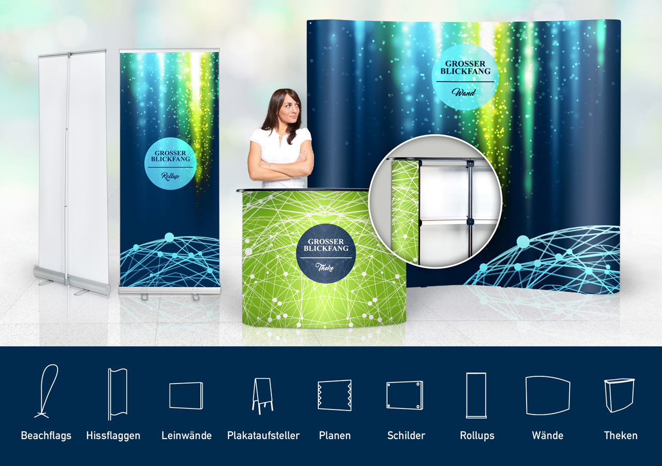 Für eine gelungene Präsentation bieten Onlinedruckereien mit entsprechend umfangreichem Sortiment wie beispielsweise print24.com nahezu ein Komplettpaket an individualisierbarer Werbetechnik sowie klassischen Druckprodukten – und das zu einem günstigen Preis. Neben vollflächig bedruckbaren Theken, Kundenstoppern und Rollups findet man im Sortiment auch großformatige Planen und Bodenaufkleber ebenso wie Broschüren, Flyer oder bedruckbare Kugelschreiber. Alle Produkte stehen mit vielen verschiedenen Individualisierungsmöglichkeiten zur Verfügung.