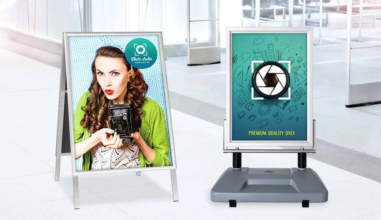 Auch vor der eigenen »Tür« lässt sich mit Werbetechnik hervorragend werben. Gerade Fotografen und Designer wissen besonders visuell zu überzeugen und können sich diese Eigenschaft beim Einsatz von Kundenstoppern oder Rollups bestens zunutze machen – denn nur wenige Sekunden entscheiden über das Interesse potenzieller Kunden! Der Vorteil dieser beiden Produkte ist dabei die Möglichkeit, Drucke auszutauschen und mit wechselnden Inhalten zu werben.