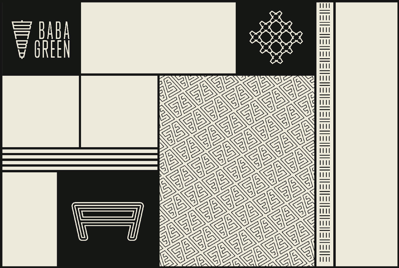 Typografisch mit dem Wort Baba (Vater) gestaltet, steht der Dönerspieß im Mittelpunkt des Erscheinungsbilds von Baba Green, einem Systemgastronomiebetrieb, der orientalische Küche ohne Geschmacksverstärker und Konservierungsstoffe serviert, und ist dabei so klar wie augenzwinkernd – und zugleich die Grundlage für zahlreiche Muster.