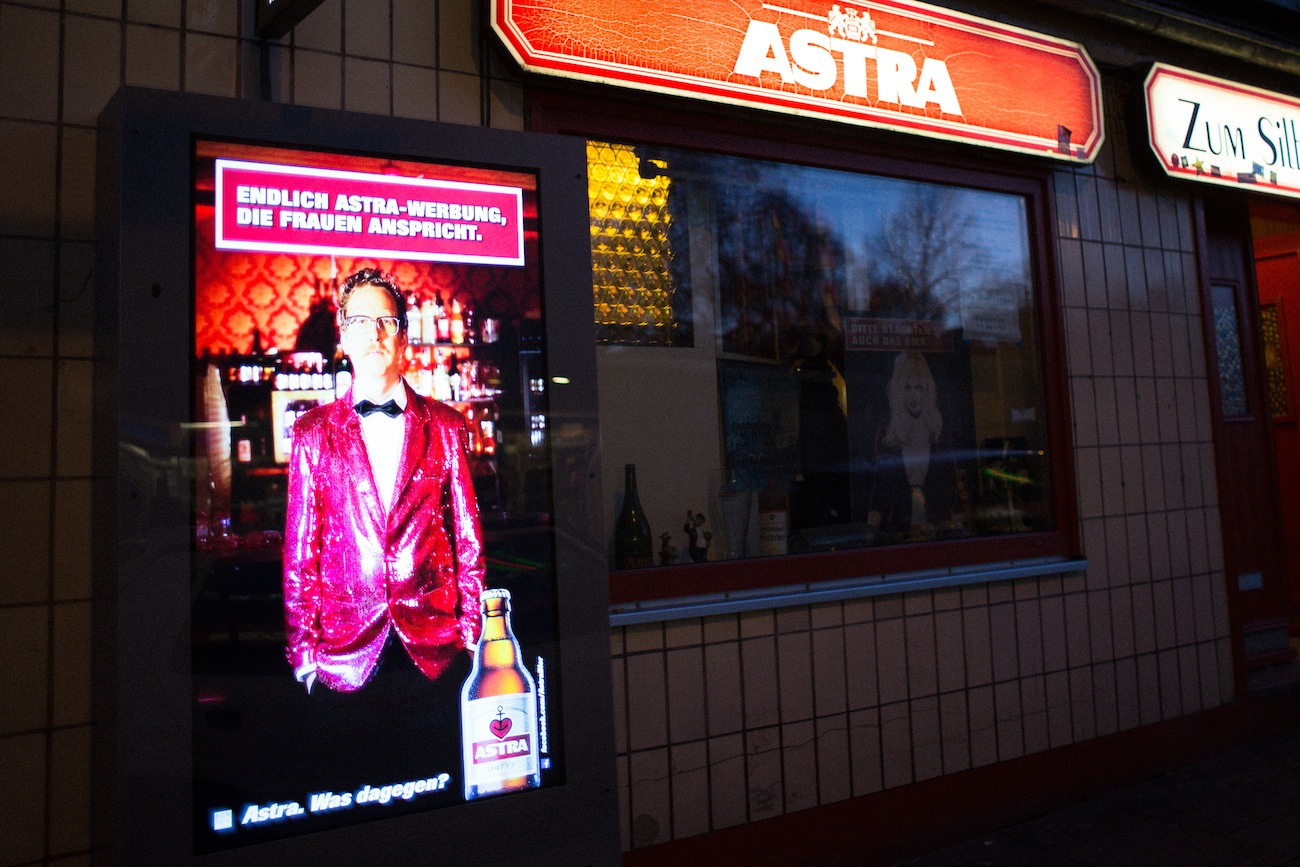 Unter dem Motto »Endlich Astra-Werbung, die Frauen anspricht« stellte die Hamburger Kreativagentur am vergangenen Samstag ein digitales City-Light-Post vor der Kneipe Zum Silbersack auf, das seine Botschaft ausschließlich an Frauen richtete.