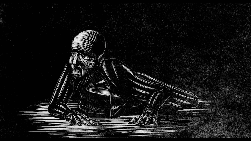Wie animierte Holz- oder Linolschnitte wirken die schwarzweißen Bilder, in denen Christoph Büttner die Geschichte eines Verurteilten erzählt, der nach zahllosen Verhören völlig ermattet, von einen Gefängnisdirektor zur Hinrichtung am nächsten Tag verurteilt wird. Doch dann öffnet sich um Mitternacht überraschend seine Zellentür …