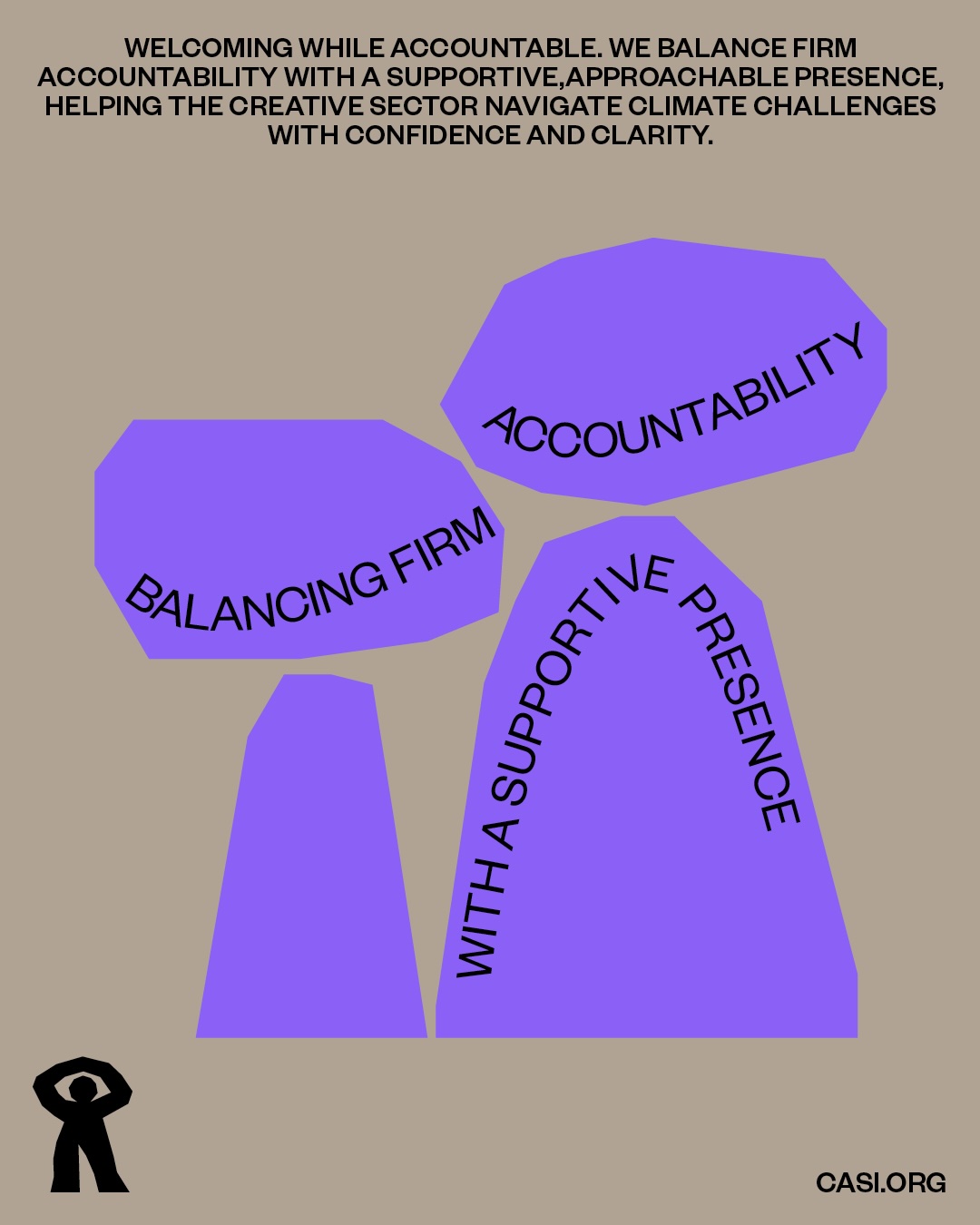 Das Logo für CASI zeigt eine stehende Figur, die ihre Arme über dem Kopf verschränkt und so gleichzeitig ein Auge entsteht. Und die in ihrer Form, ihren groben Kanten und kräftigen Proportionen weit in der Menschheitsgeschichte zurückgeht.