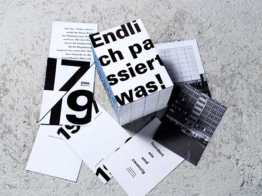 Der blaue Bock – wie ein alter blauer Plattenbau im Zentrum Magdeburgs genannt wird – als Block: wirDesign verwandelte den Geschäftsbericht 2016 der Städtischen Werke Magdeburg (SWM), in einen Abreißkalender, der die Neugestaltung des Areals darlegt.