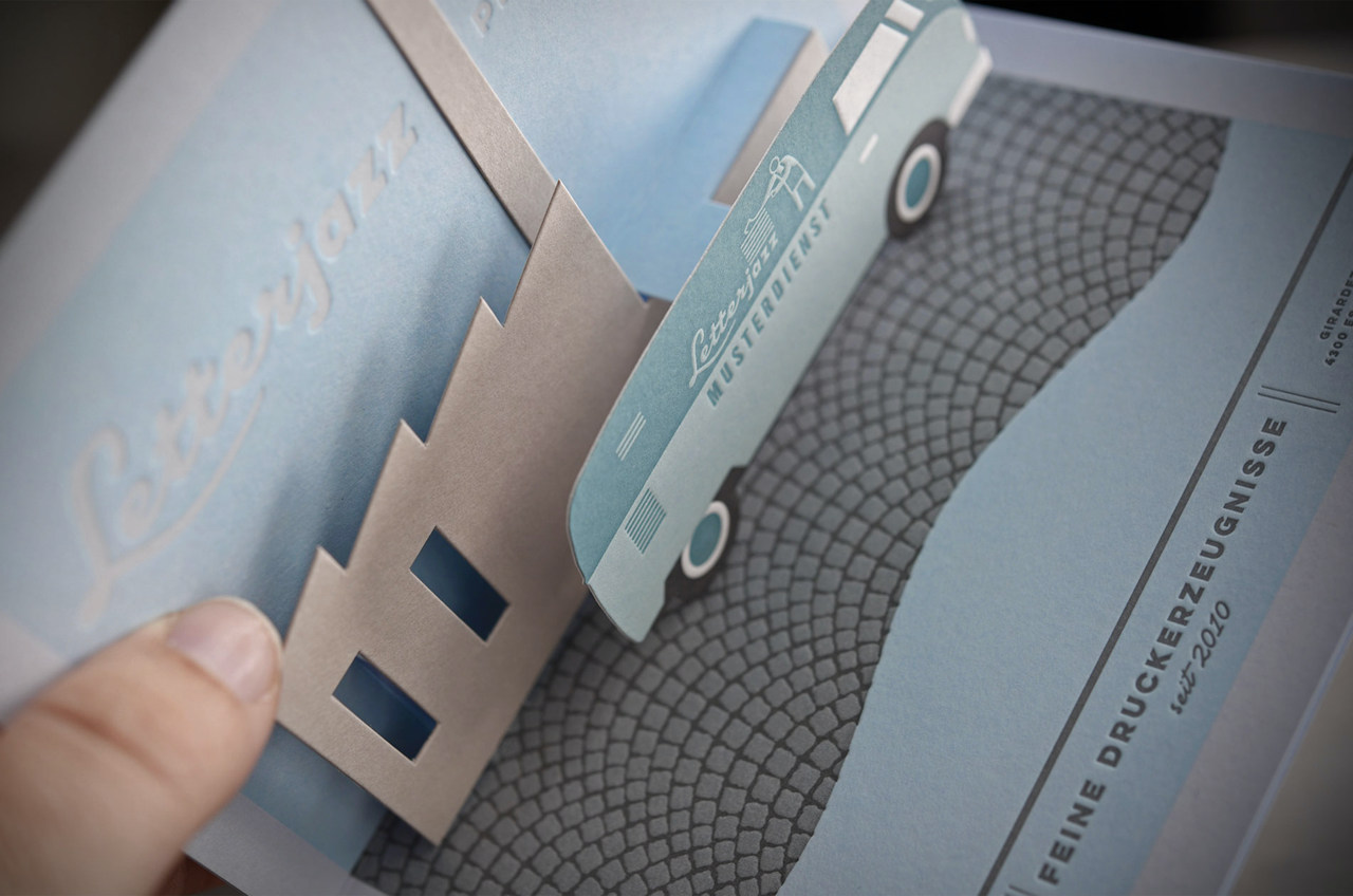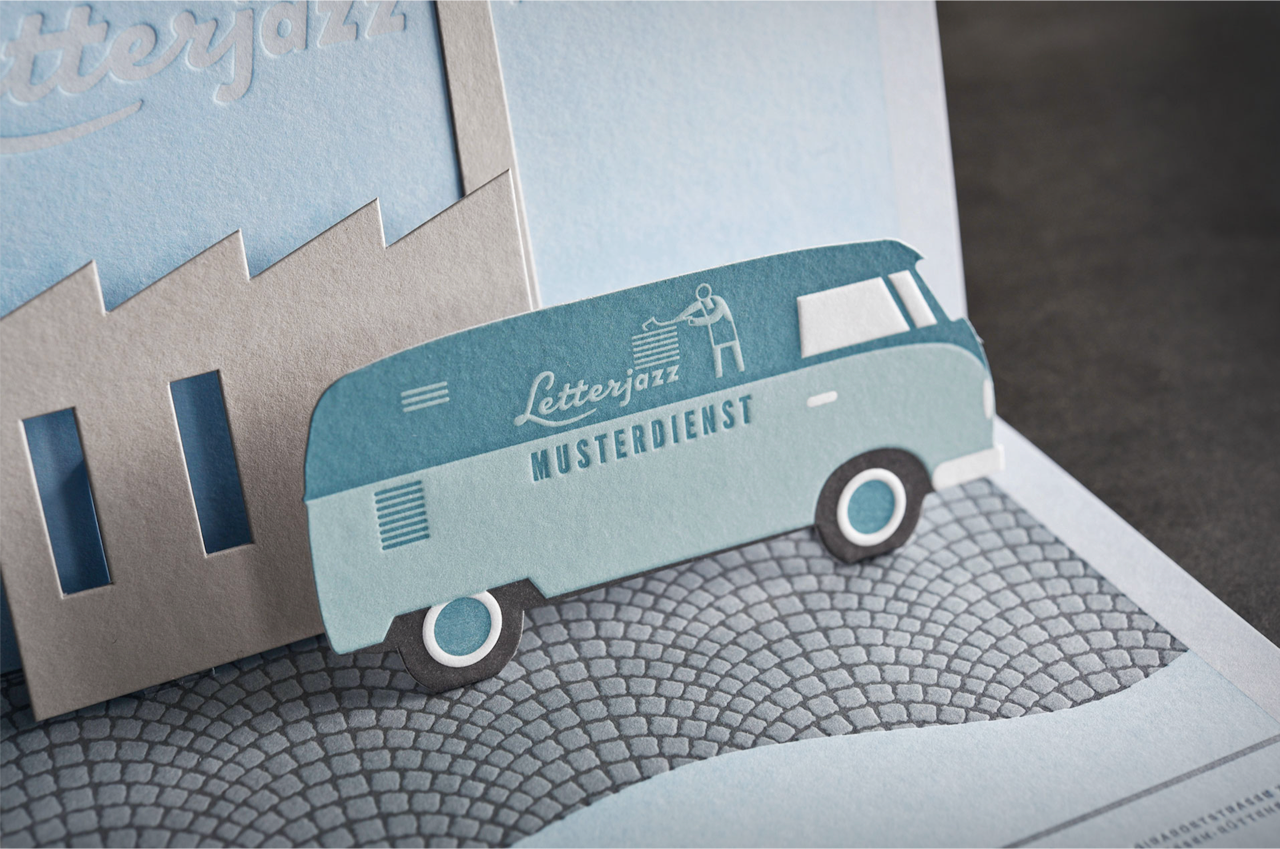 Die Vorlage für das Pop-up-Motiv illustrierte Dirk Uhlenbrock, Gestalter und Illustrator sowie »House Artist« von Letterjazz. Um die Konstruktion kümmerte sich der Papierkünstler Peter Dahmen, der auf Pop-up-Karten spezialisiert ist. Und das Papier stammt von Gmund.