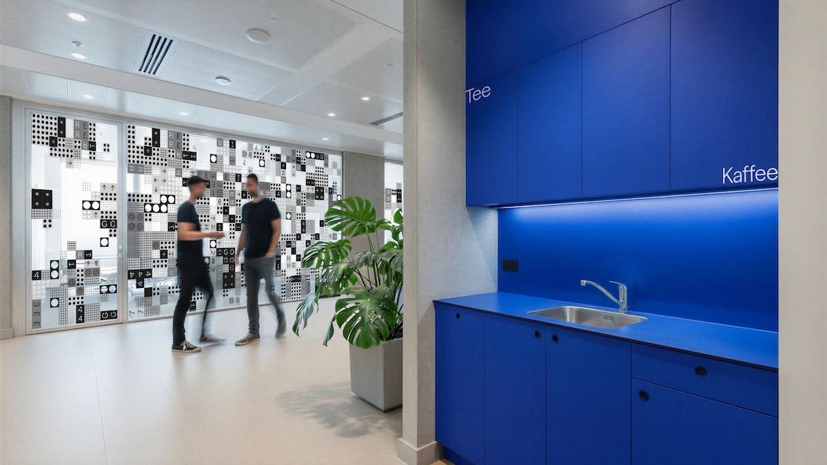 Die Palette ist dabei ganz reduziert. Sie beschränkt sich auf ein leuchtendes »Electric Blue«, das für »digitale Kompetenz, technologische Präzision und Zukunftsfähigkeit« steht und dabei gleichzeitig auch sehr zeitgemäß wirkt. Begleitet wird es von einem »Binary Black«, einem »Clarity White« und den Grautönen »Cool Gray Dark« und »Cool Gray Light«.