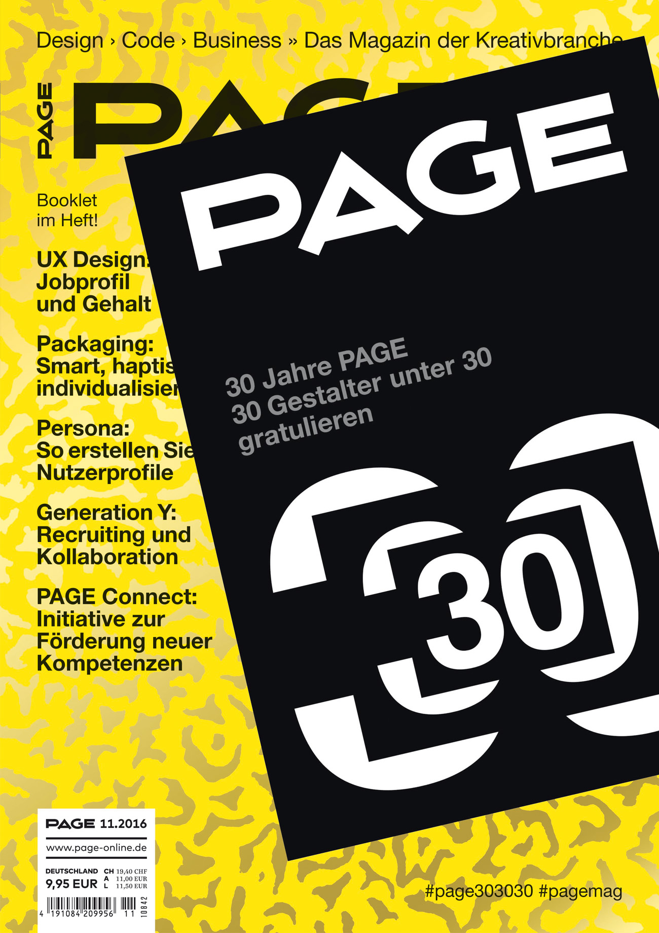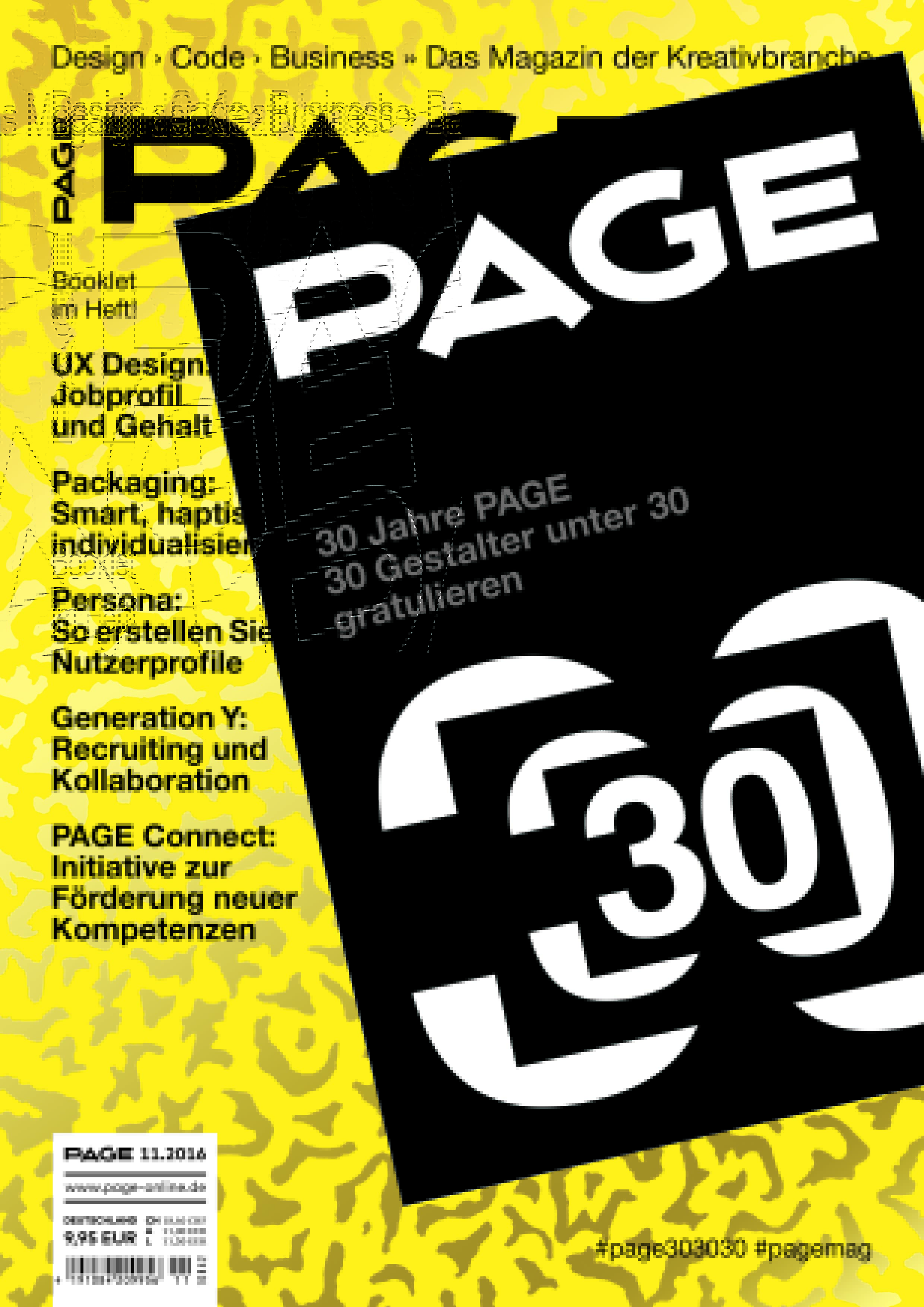 Also feiern Sie mit uns in »PAGE 30/30/30« – so der Titel des aufwendig veredelten Gratulations-Booklets, für das wir 30 junge Gestalter unter 30 um ihre kreativen Kommentare zu 30 Jahren PAGE baten. Ein kleines Bilderbuch ist es geworden – und die Titelgeschichte von PAGE 11.2016 stellt die Urheber, die gerade in eine anspruchsvolle Designkarriere starten, in Wort und Bild vor.