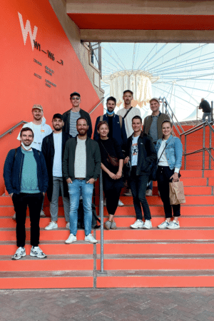 Die Gestaltung wird innerhalb der Gebäude weitergeführt, das markante V des Logos, das Rot des Corporate Designs und der 45° Winkel wurden dabei übernommen.
