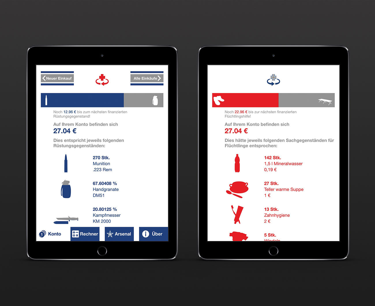 Auf dem iPad konnten Nutzer sich ausrechnen lassen wie viel von der Mehrwertsteuer ihrer Einkäufe in die Waffenkäufe der Bundeswehr fließt – von Panzern über Handgranaten, Messern zu Munition.