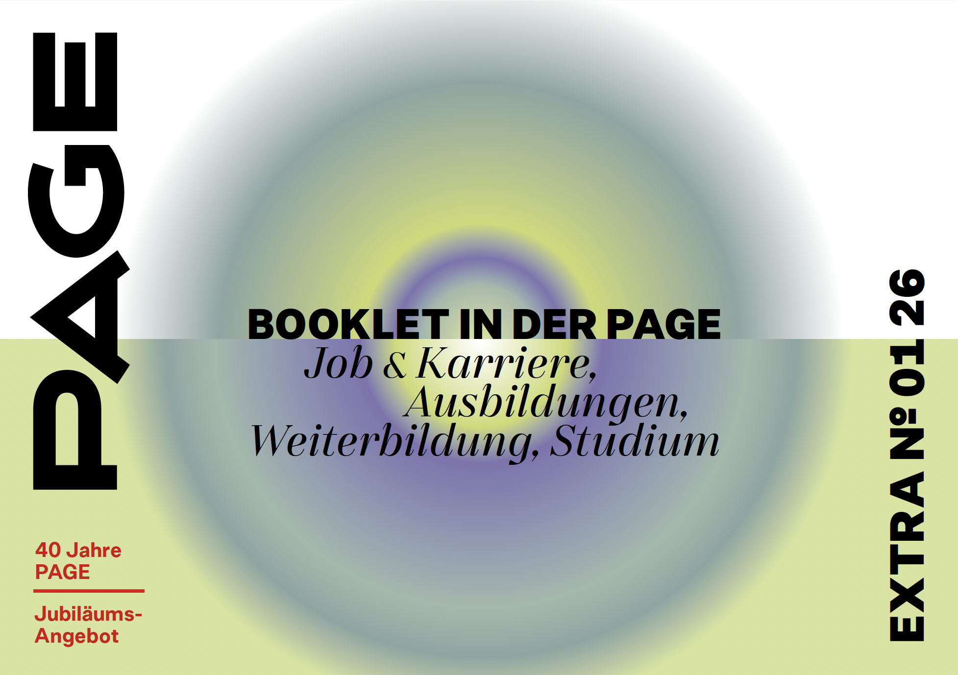 Das Booklet erscheint als Beileger in der März-Ausgabe (EVT 4. März 2026) und zusätzlich auf page-online.de. Mit dem Booklet erreichst du eine designaffine, berufsorientierte Zielgruppe: Student:innen und Studieninteressierte, Nachwuchskreative beim Einstieg in die Branche und Designer:innen und Kreative, die sich fachlich weiterentwickeln oder neu positionieren wollen.