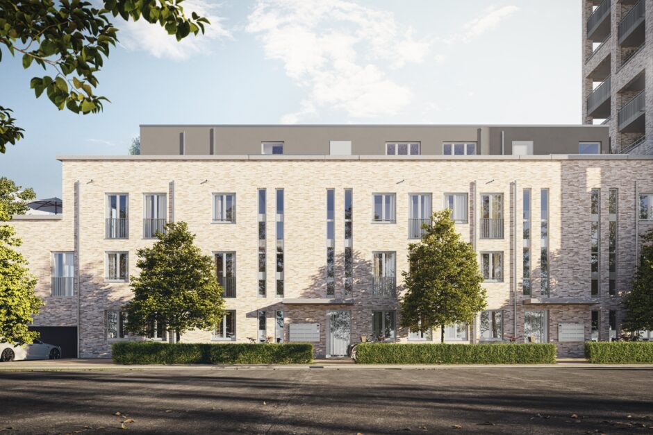 Das architektonisch ansprechende, u-förmige Gebäudeensemble wird von einem markanten, 42 Meter hohen Wohnturm überragt, der zum Wahrzeichen des Quartiers avanciert. Der von uns entwickelte Name „Aves Quartier“ ist dabei mehr als nur eine Bezeichnung: „Aves“ ist lateinisch für „Vögel“ und greift nicht nur den schützenden Nest-Charakter des fast völlig umschlossenen, grünen Innenhofs auf, der zum Verweilen und zur Begegnung einlädt. Die Symbolik findet sich auch buchstäblich auf dem außenliegenden Treppenhaus des Wohnturms wieder: Ein in die Blechverkleidung gefräster Vogelschwarm steigt dynamisch von der darunterliegenden Plaza auf und entfaltet sich entlang der gesamten Höhe des Gebäudes – ein beeindruckendes Kunstwerk und ein visueller Ankerpunkt.