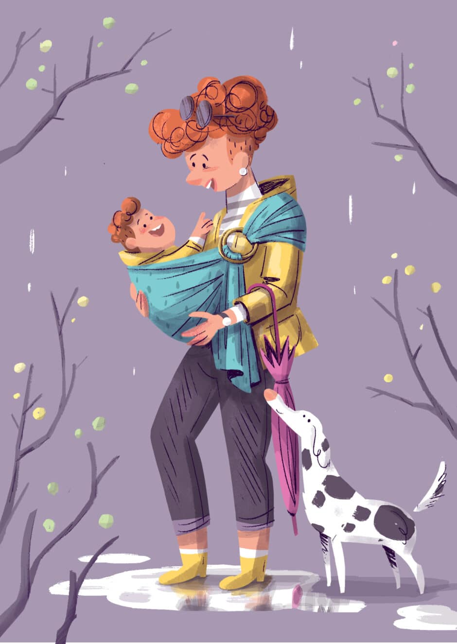 Families Postkartenreihe Postkarten-Illustrationen für österreichisches Babysling-Label. Die Idee: Babyslingmodelle zusammen mit den verschiedener Familienkonzepten abzubilden.