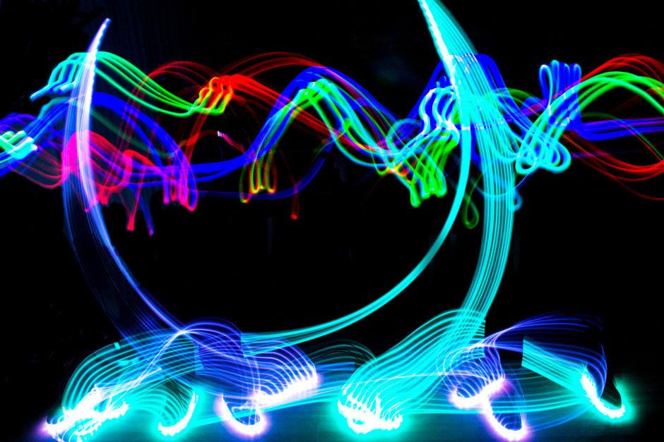 Durch die Verwendung von Handschuhe mit LED ́s ,sowie beleuchteten Schuhe können Bewegungen durch Langzeitbelichtung sichtbar gemacht werden.
