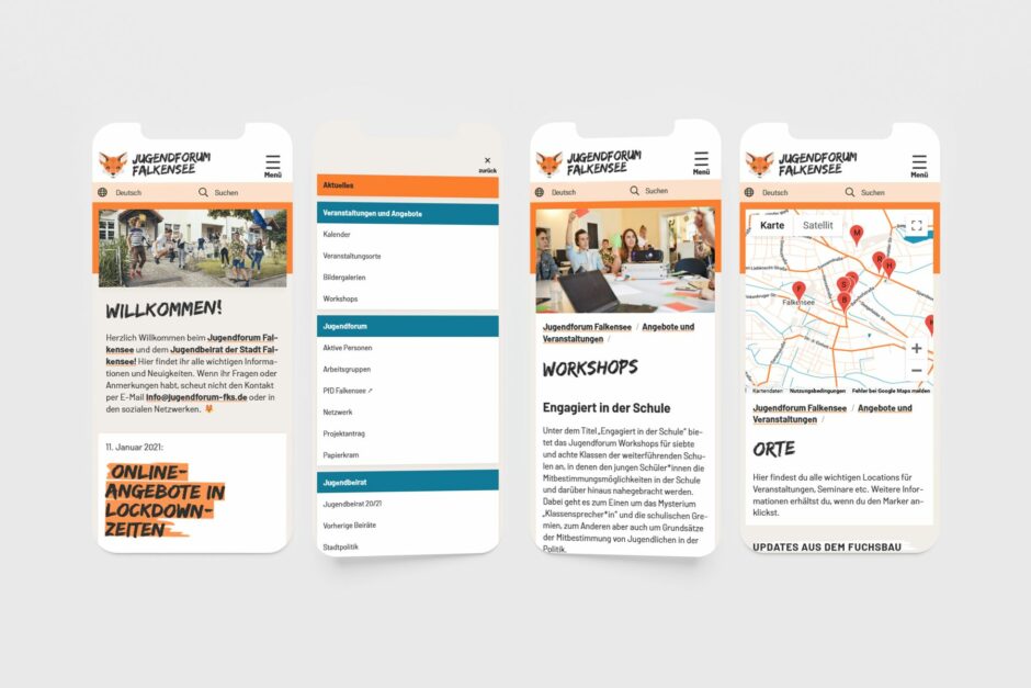 Gemeinsam mit den Jugendlichen habe ich eine neue Website ausgefuchst. Aufbauend auf bestehendes Gestaltungsmaterial, unter anderem dem markanten Fuchs-Logo, entstand ein modernes, ästhetisches Online-Portal, welches das Jugendforum so facettenreich zeigt, wie es ist. Und: Zielgruppengerecht erfolgte die Gestaltung dieses Fuchsbaus »mobile first«, damit die Bedienung unterwegs ohne Abstriche und Kompromisse funktioniert.
