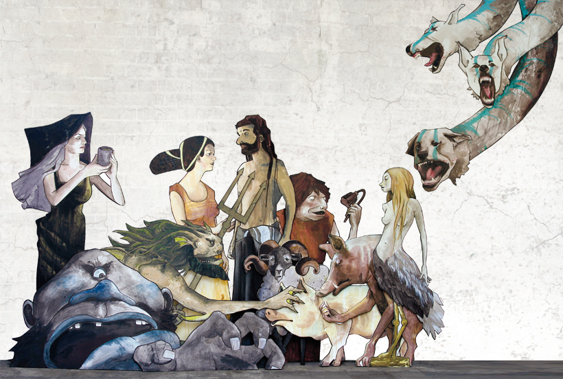 Illustration der Protagonisten der Odyssee als lebensgroße Holzfiguren