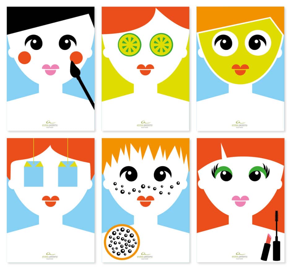 Kosmetik Perdomo Serie von Plakaten und Postkarten zur Hervorhebung wechselnder Behandlungsangebote für das Kosmetikinsitut Andrea Perdomo.