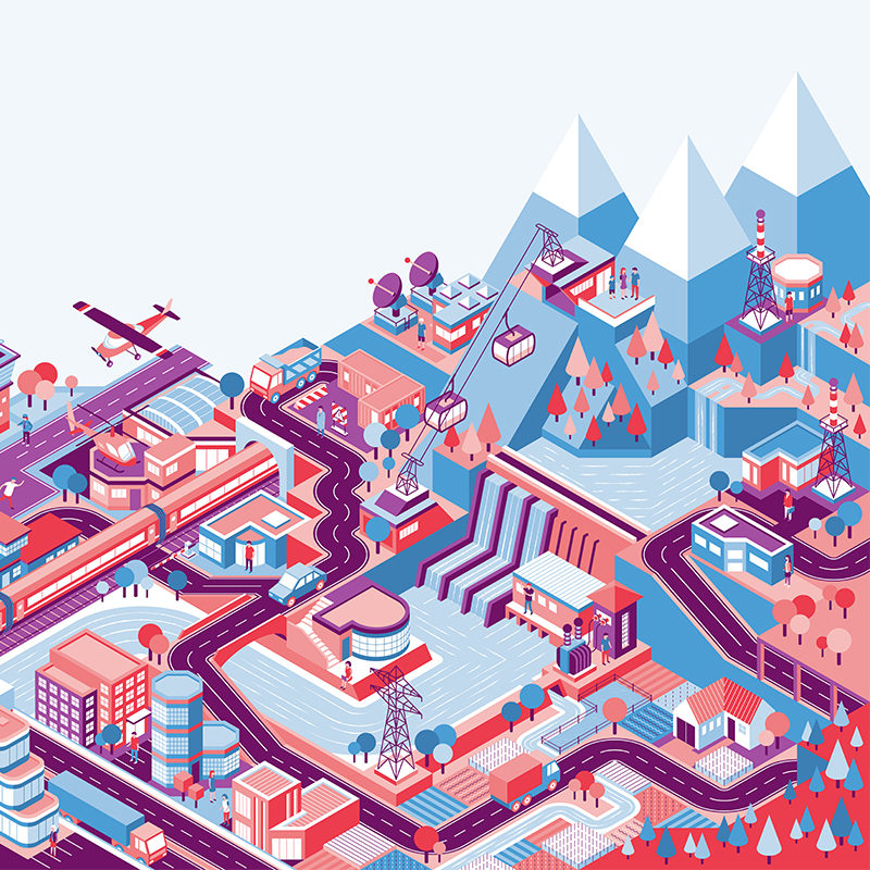 Isometric wimmel-illustration about a alpine scenery for the landing page of UVEK, Switzerland’s Federal Department of the Environment, Transport, Energy and Communications. The illustration is part of an interactive map for job offers and their typical categories and was directed by CRK Kommunikation, Switzerland. Client: UVEK / CRK Kommunikation, 2018 https://www.joblandkarte.uvek.admin.ch/de/