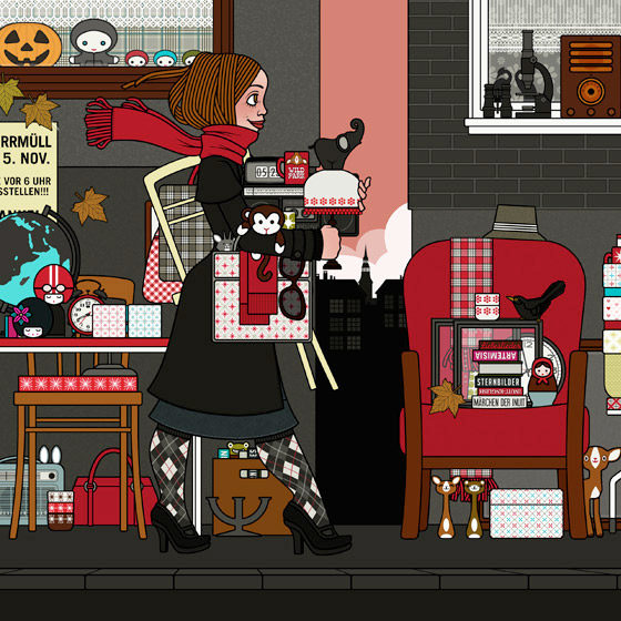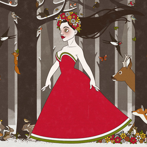 Im Februar habe ich aus lauter Freude über einige sehr verfrühte Blumen (Ringelblumen, Gänseblümchen und Osterglocken) Flora gezeichnet, die durch den Wald schreitet und endlich den langersehnten Frühling bringt. Und alsbald haben sich dann auch einige Waldtiere um sie versammelt, nämlich Füchse, Eichhörnchen, Schwalben, Tagpfauenaugen, Waschbär, Dachs, Igel, Hase, Baummarder, Falke, Frischling, Haselmäuse, Eichelhäher, Elster,…