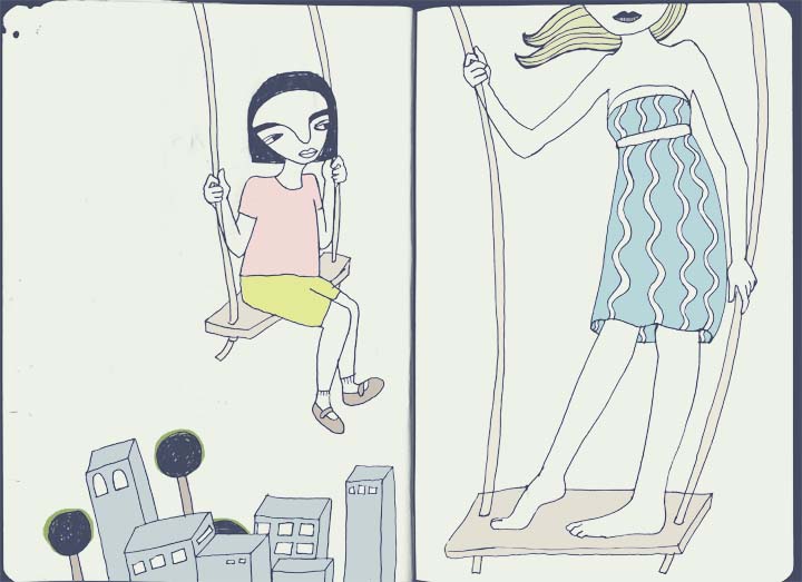 Schaukelnde Mädchen. Colorierte Skizzenbuch-Seite.