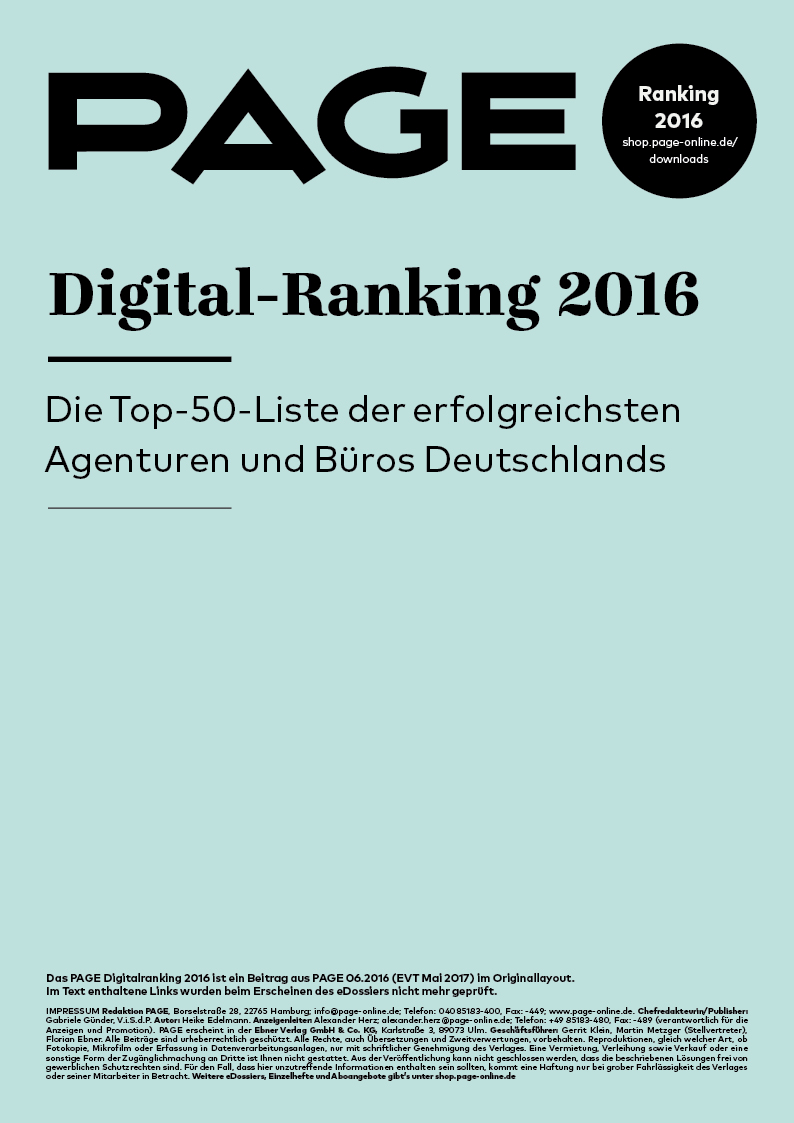 Lesen Sie selbst rein, wer die glücklichen Gewinner, Aufsteiger und Einsteiger sind und was sie zu sagen haben. Die Top-50-Tabelle des PAGE Digital Ranking 2016: In ihr beziffern wir den Ist-Zustand unter den deutschen Digitalagenturen: Wer konnte 2015 mit seinen Einreichungen besonders punkten? Und was hat sich getan im Vergleich zu 2014? Auf welche Aufsteiger, Neueinsteiger oder seit Jahren Bestplatzierten müssen Sie sich dieses Jahr einstellen?