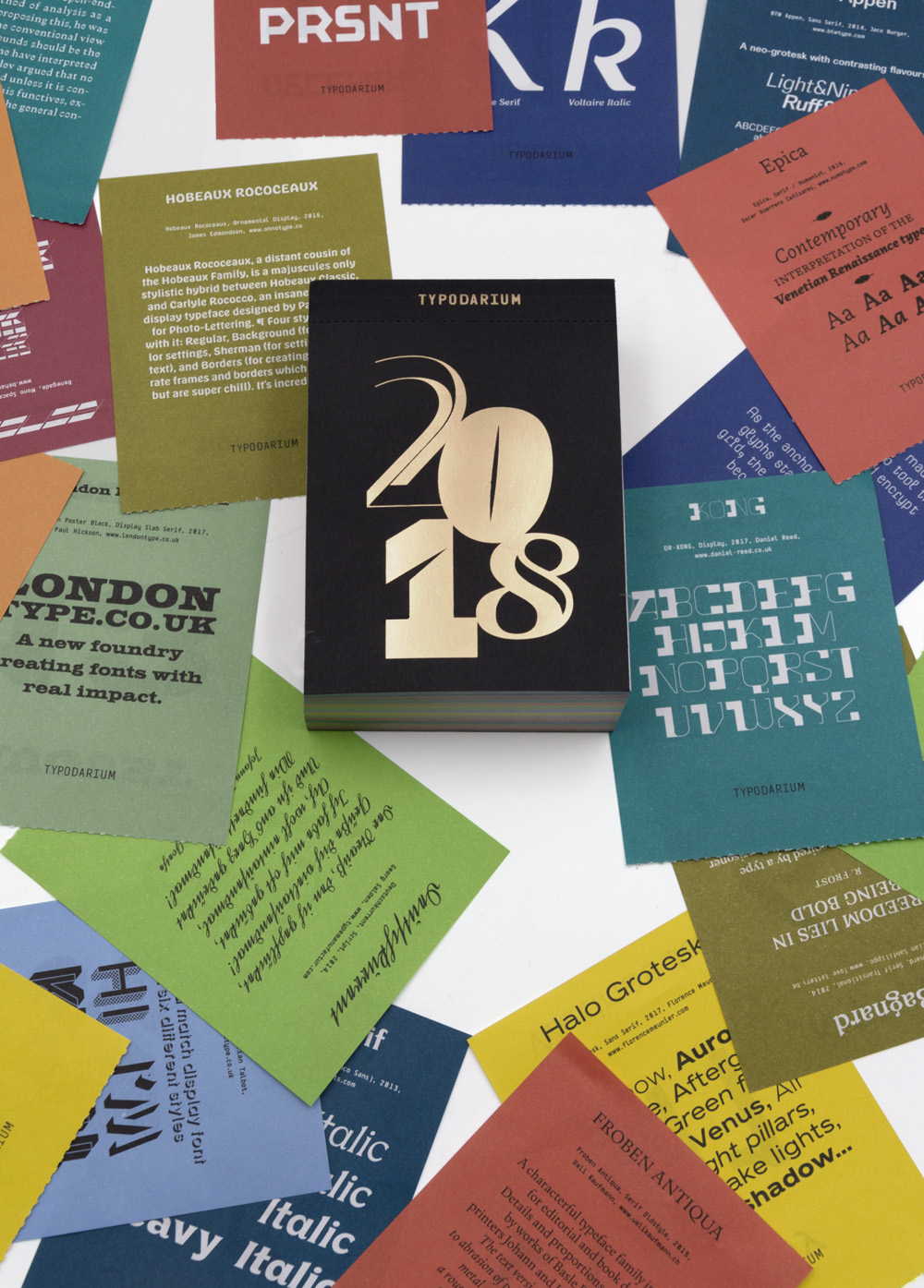 Zum Jubiläum ist das Typodarium wie ein kleiner Goldbarren verpackt, frei nach dem Motto: die richtige Schrift ist Gold wert. In dieser Ausgabe ist kein Designer doppelt vertreten, macht also 366 Fonts von 366 Designern aus 41 Ländern, gedruckt in 12 Farben.