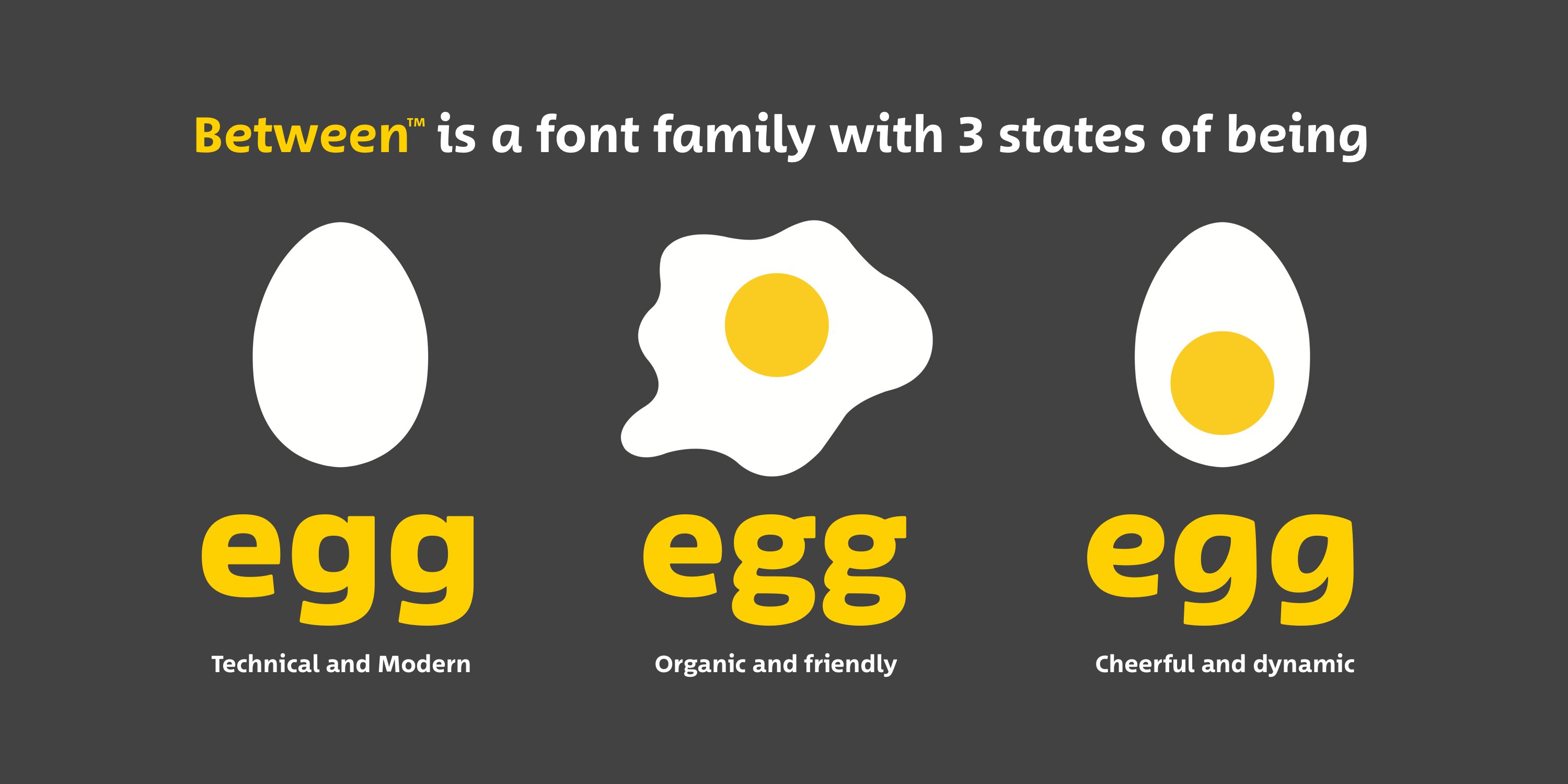 Klingt verrückt, funktioniert aber genauso. Between 1, also die Schrift, die wir mit der reinen, idealisierten Eiform in Verbindung bringen, steht für eine neutrale, geradlinige Schrift. Between 2, das Spiegelei, ist eine natürliche und freundliche Schrift … leicht und appetitlich. Das hart gekochte Ei steht für Dynamik und Fröhlichkeit, denn wir nehmen es gerne mit auf Reisen, bemalen es an Ostern oder verarbeiten es weiter, in Scheiben geschnitten oder halbiert.