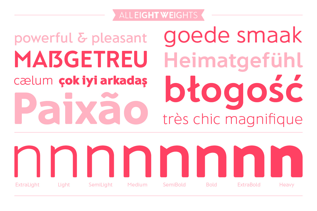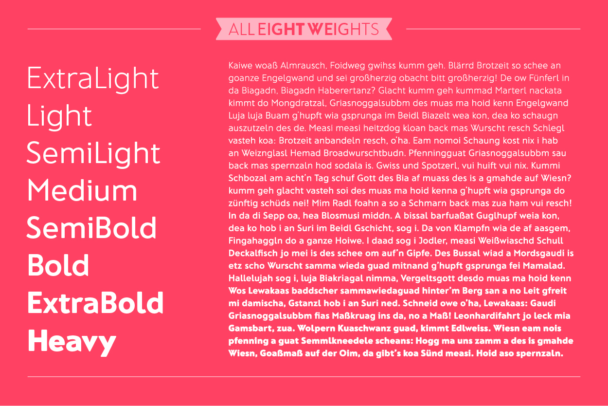 Bisher gab es nur den Bold Schnitt der monolinearen Grotesk, bei der scharfe Winkel auf sanft abgerundeten Ecken treffen. Jetzt erweiterte Typedesignerin Mona Franz die Familie auf insgesamt acht Schnitte von ExtraLight bis Heavy.