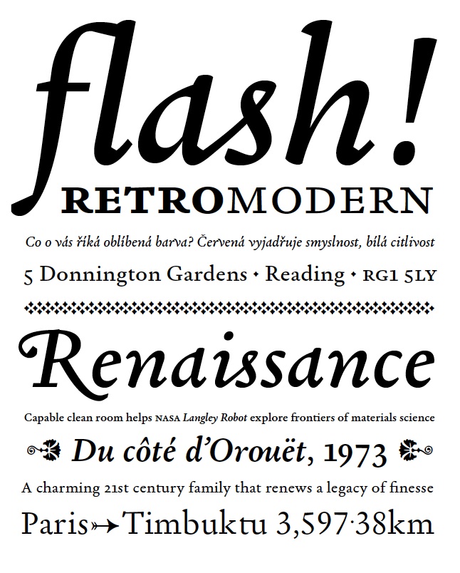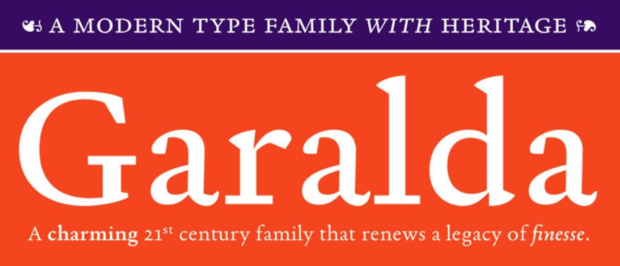 Die so entstandene Garalda ist eine zeitgenössische Familie mit einem geschichtsträchtigen Erbe, die natürlich vor allem in langen Fließtexten einen ausgezeichneten Job macht. Aber auch in Displaygrößen lässt sie sich einsetzen. Hier kommen einige ungewöhnliche Details, die der Typedesigner seiner Schrift zum Ausdruck mitgab.