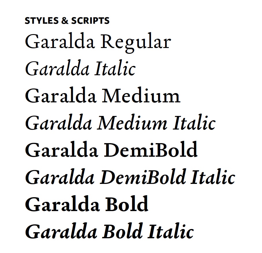 Garalda gibt es in Regular, Medium, DemiBold und Bold plus die passenden Italics. Sie kostet knapp 300 Euro. Erhältlich ist sie über TypeTogether, dort findet man auch ein Interview mit Xavier Dupré zur Entstehungsgeschichte der Garalda.