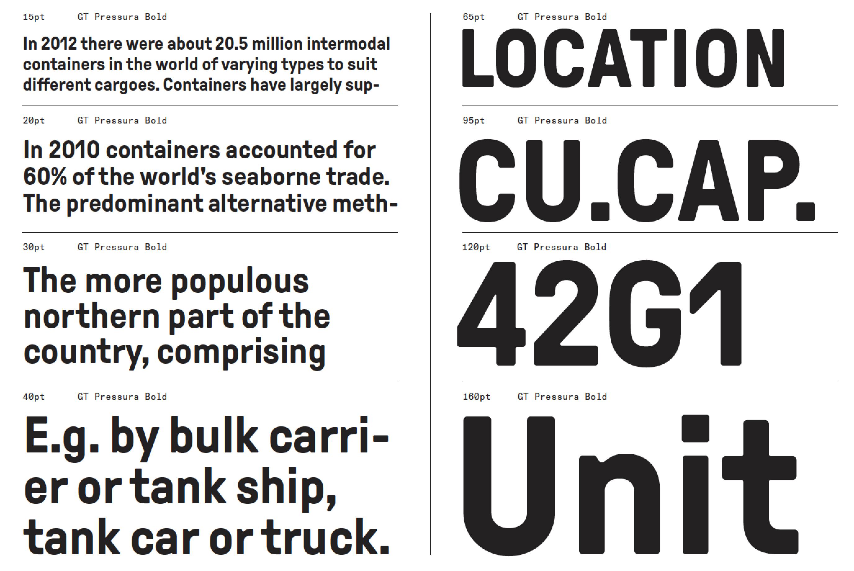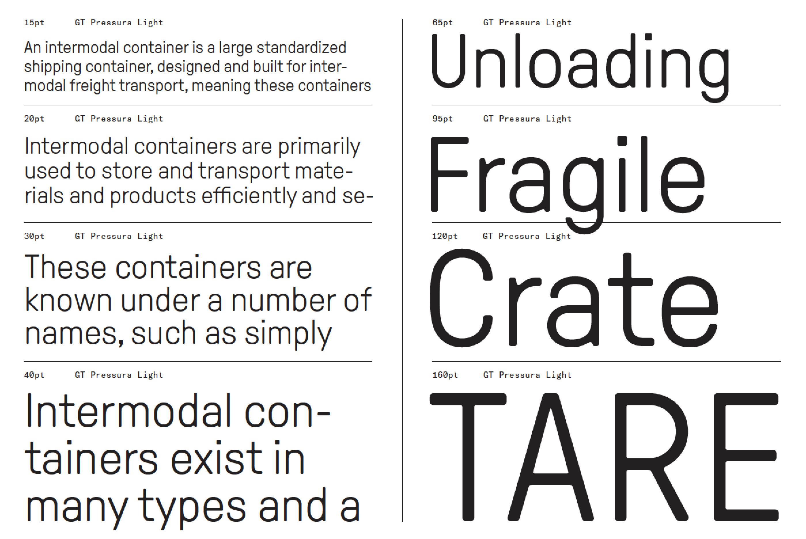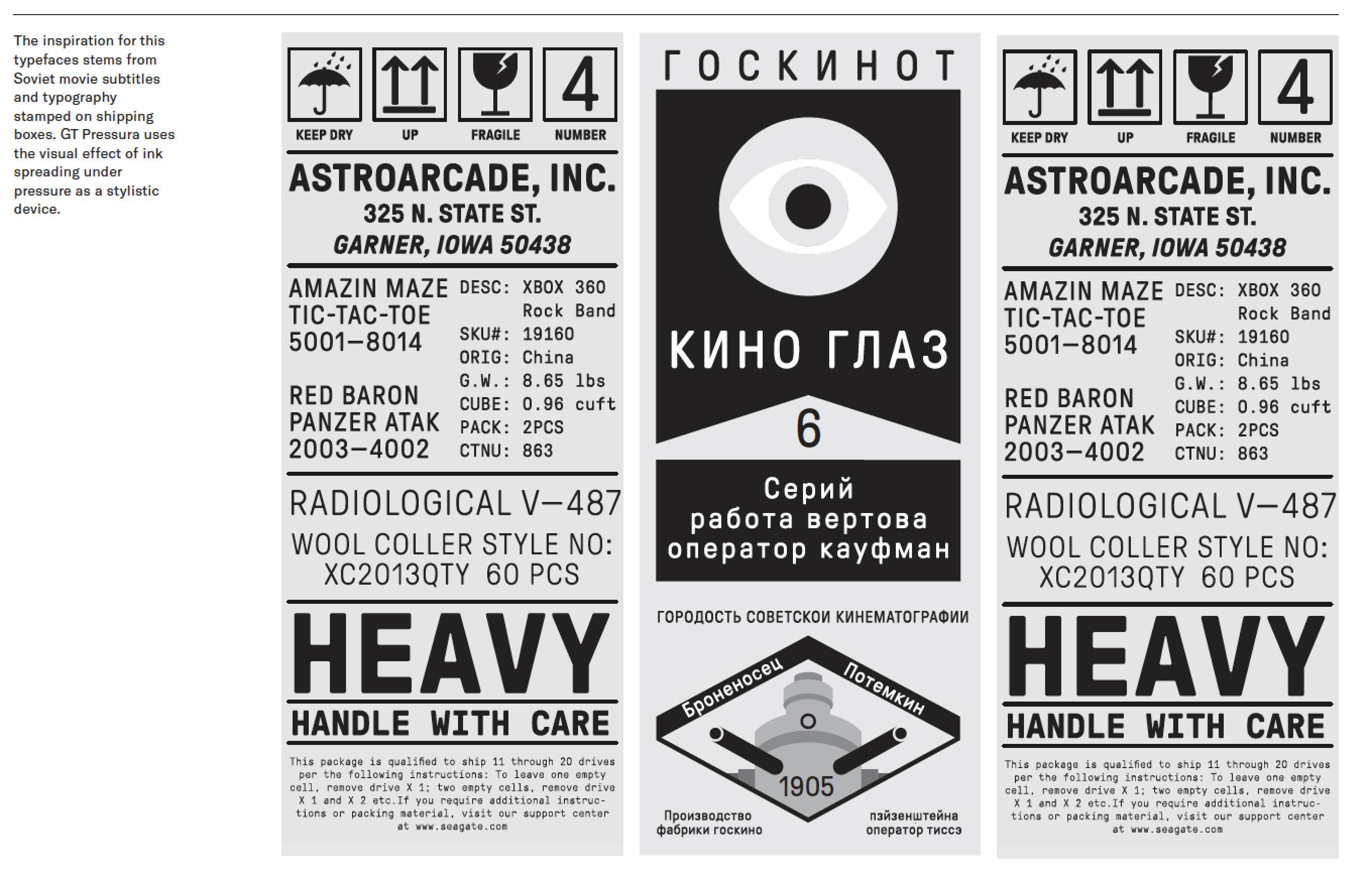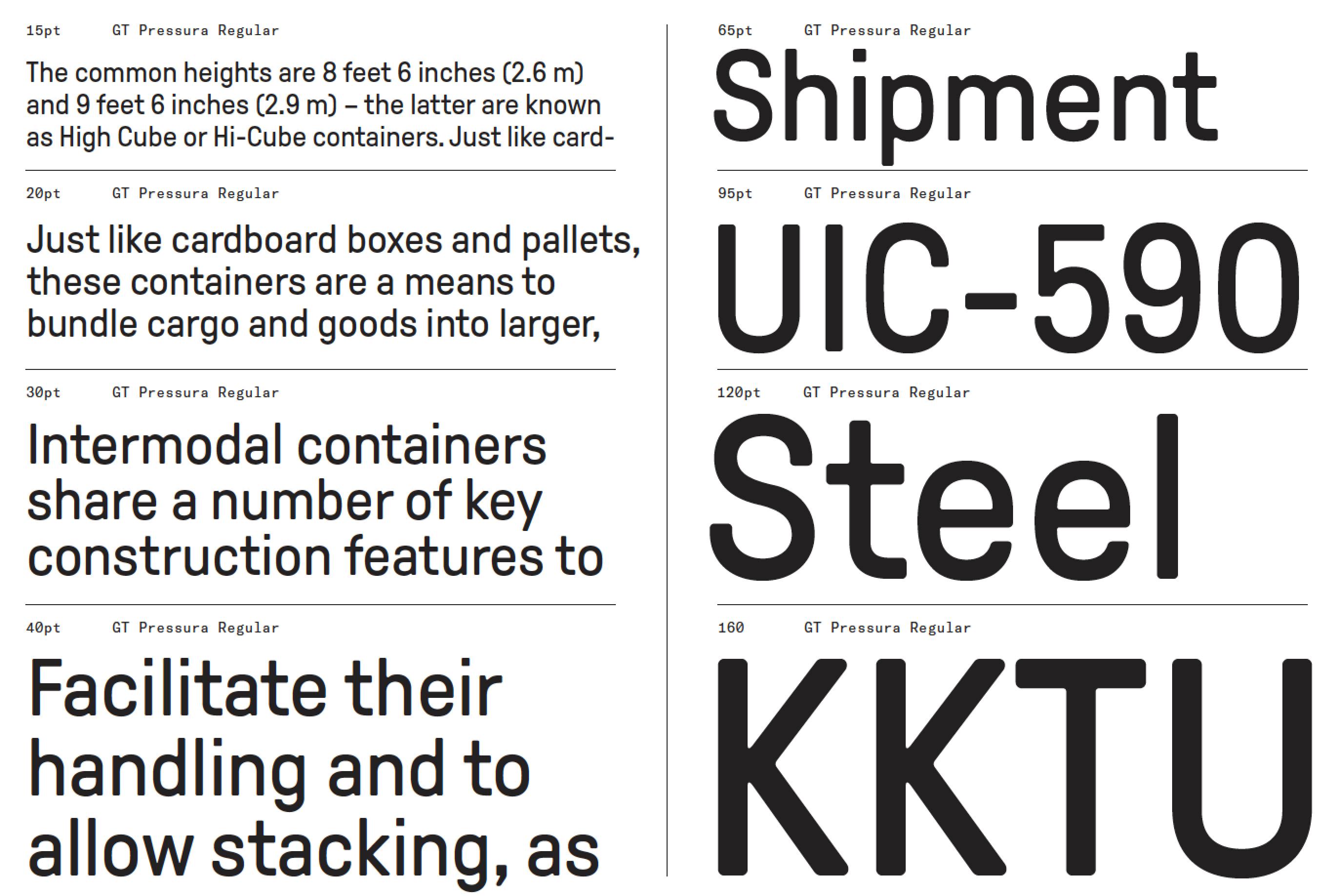 Der Druck, mit dem die Bleisatzschriften aufs Papier gedrückt wurden, beeinflusste auch die Form der Buchstaben. Von diesem Erbe ist GT Pressura ebenso inspiriert wie von technischen Lettern, die auf Frachtkisten gestempelt wurden. Die Designer Marc Kappeler und Dominik Huber vom schweizerischen Gestaltungsbüro Moiré hatten die Pressura schon 2012 entworfen, jetzt erweiterten sie die Familie um eine kyrillische Variante und überarbeiteten bei der Gelegenheit gleich alle Glyphen.