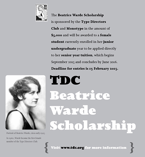 Die am 20. September 1900 geborene Journalistin, Typografin und Lehrende Beatrice Warde war das erste weibliche Mitglied des Type Directors Club New York. Das war für den TDC Grund genug, um mit Unterstützung von Monotype ein mit 5000 Dollar dotiertes Stipendium ins Leben zu rufen. Damit soll vonSeptember 2015 bis Mai 2016 eine weibliche Studentin unterstützt werden, die besonderes typografisches Talent an den Tag legt.